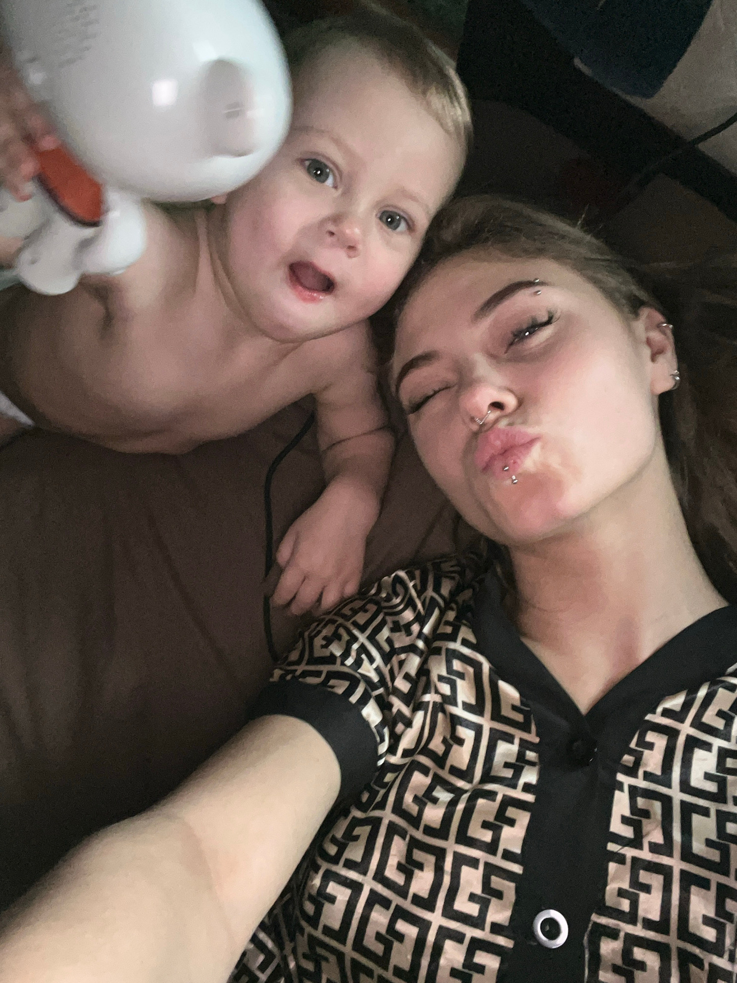 A young woman with multiple piercings on her face, including eyebrow, lip, and ear piercings, is lying on a brown surface next to a baby. The woman is wearing a button-up shirt with a black and tan ge…read more