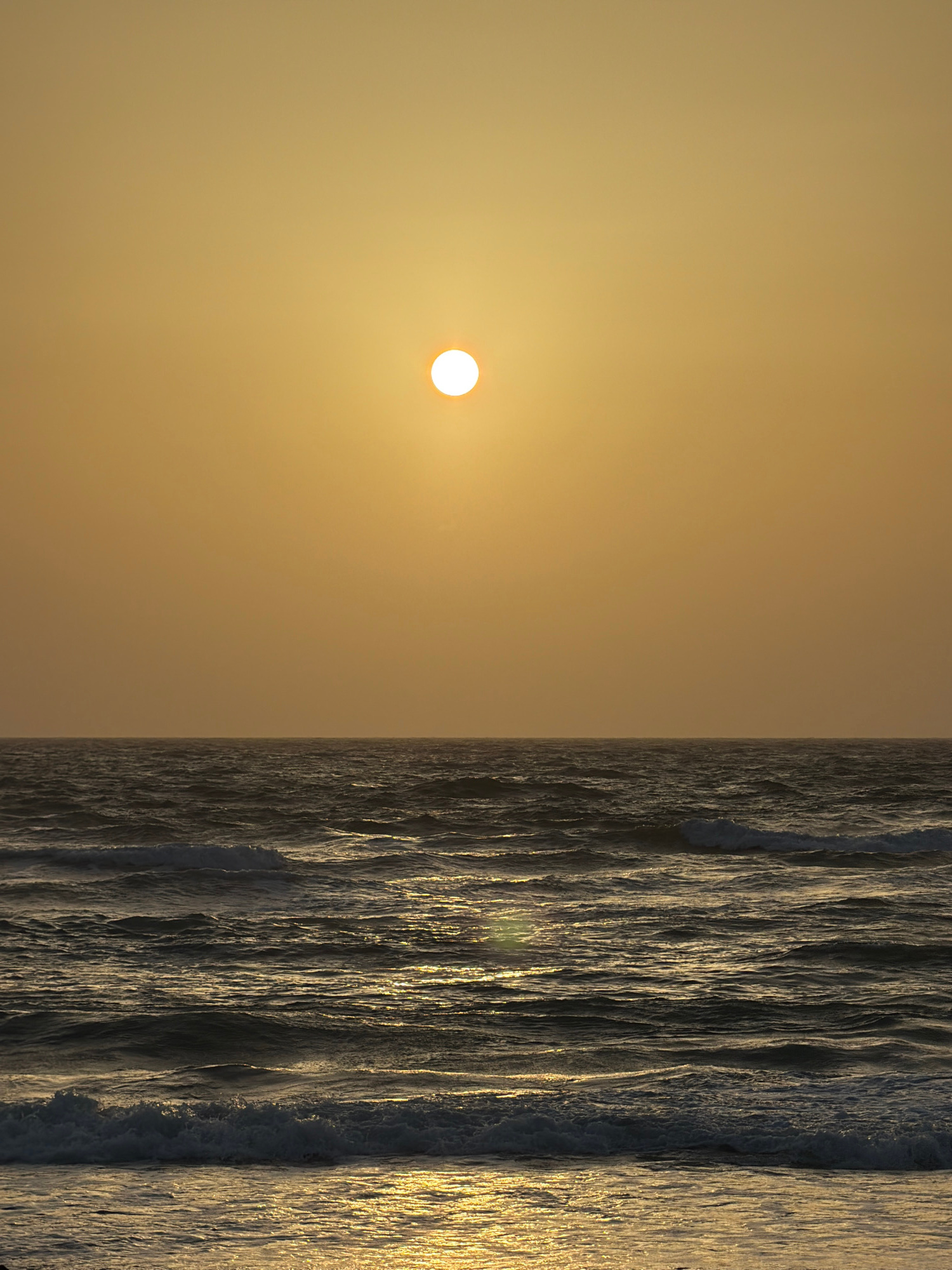 The image shows a sunset at the beach in Tel Aviv, Israel. On the left, a pale yellow sky is dominated by a bright sun, positioned slightly above the center. To the right, there's a vertical band of o…read more
