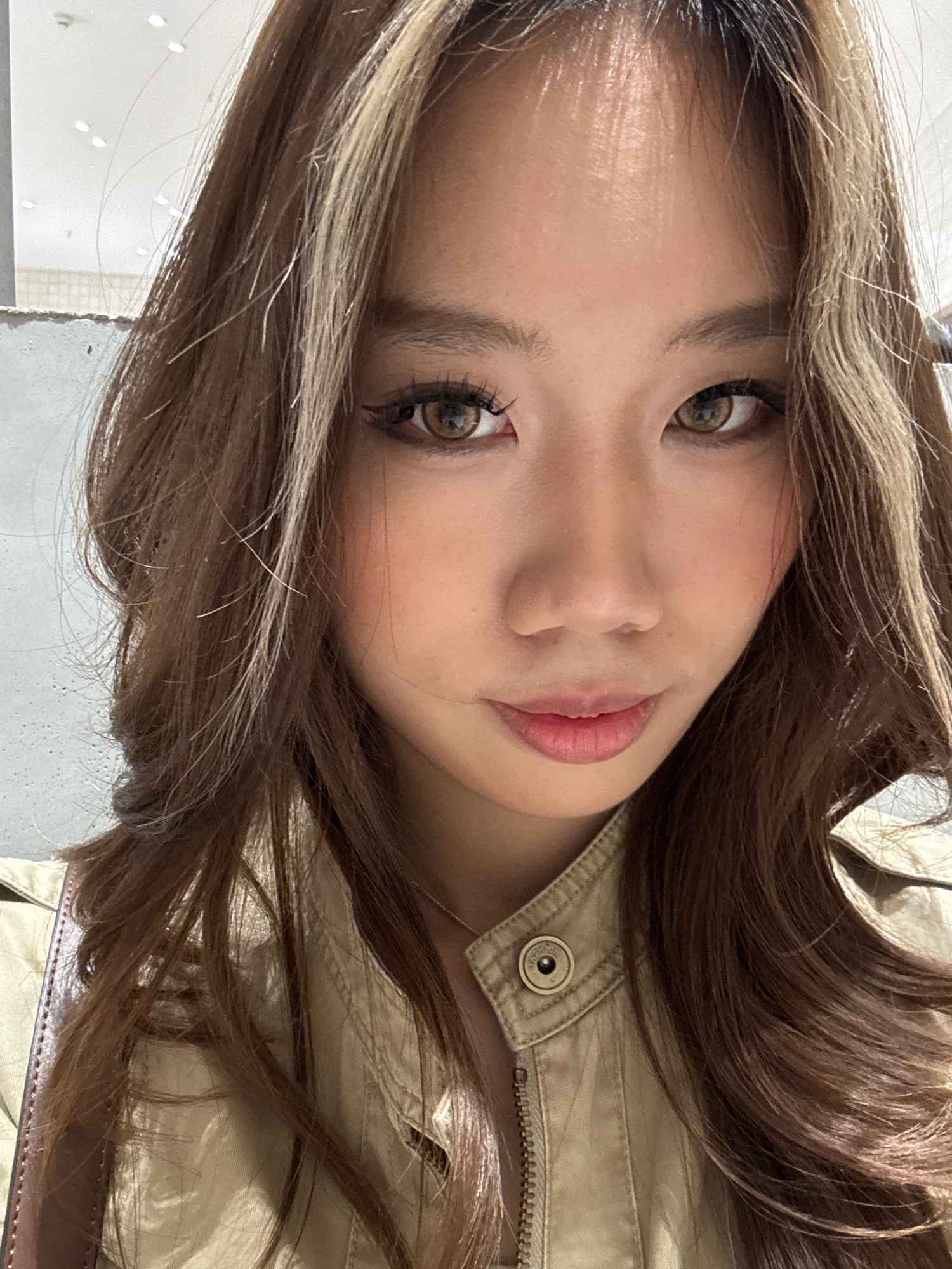 A close-up, slightly angled portrait shows a woman with light brown hair with blonde highlights. She has light skin, brown eyes, and light pink lips. She is wearing a khaki-colored jacket with a visib…read more