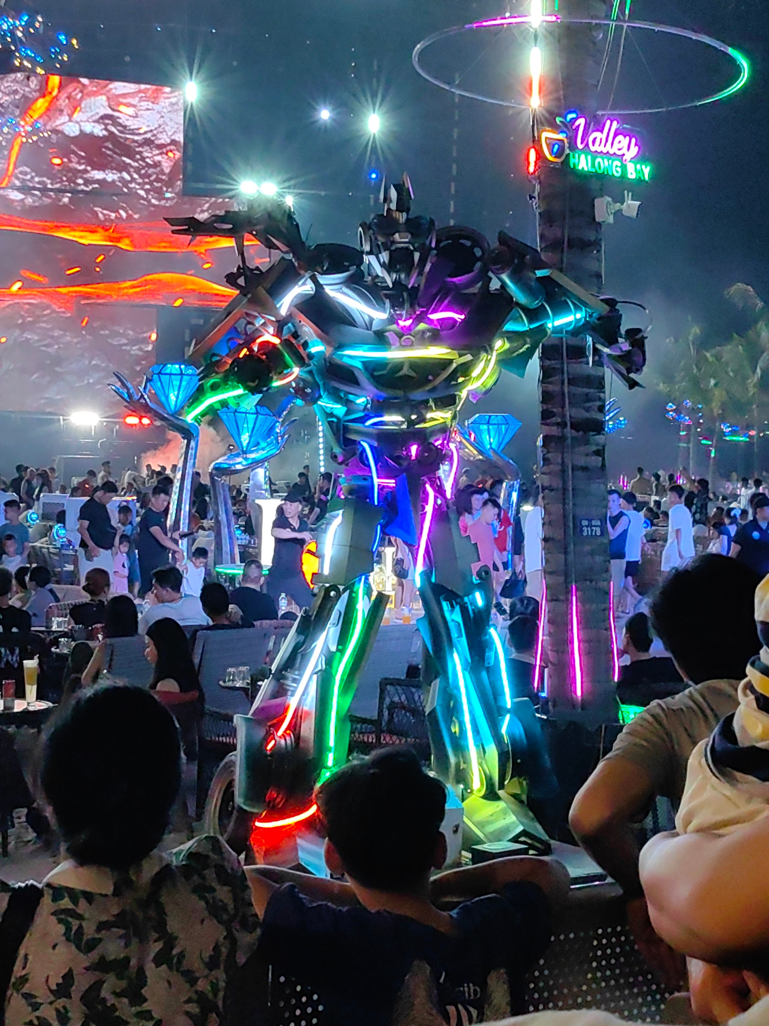 A nighttime scene in Bai Chay Ward, Vietnam, shows a large, brightly lit robotic figure standing among a crowd of people. The robot, adorned with neon lights of various colors (green, blue, purple, an…read more