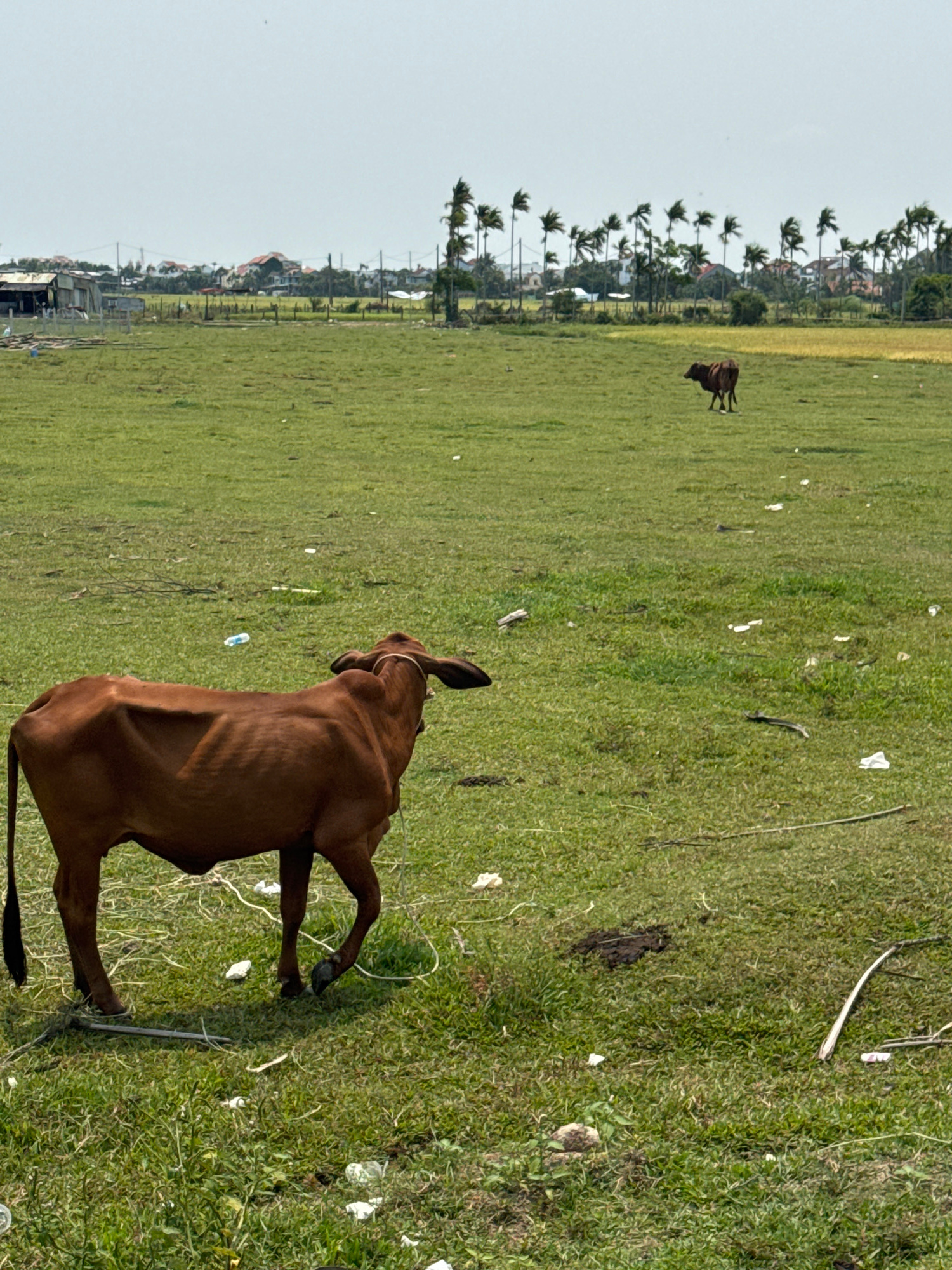 The image depicts a wide, sunlit green field under a clear, bright sky, likely in a rural or semi-urban setting. Along the distant horizon, a line of palm trees marks the edge of the field, with sever…read more