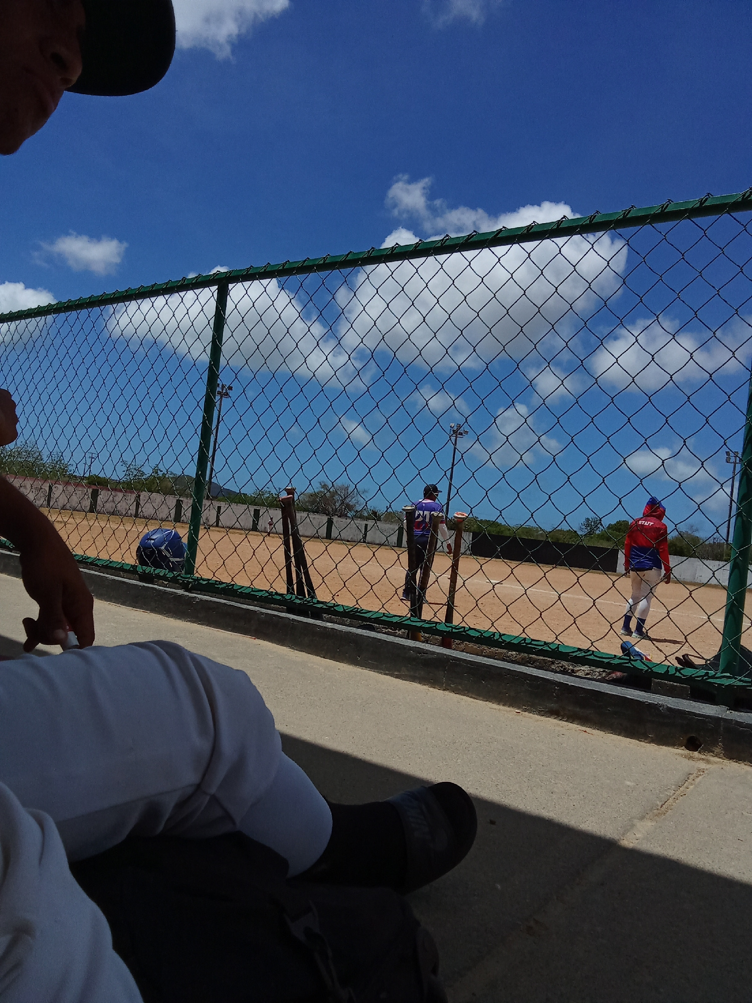 A person is observing a baseball field through a chain-link fence. Two individuals wearing baseball uniforms are on the field. One individual is wearing a purple and black uniform and another person i…read more