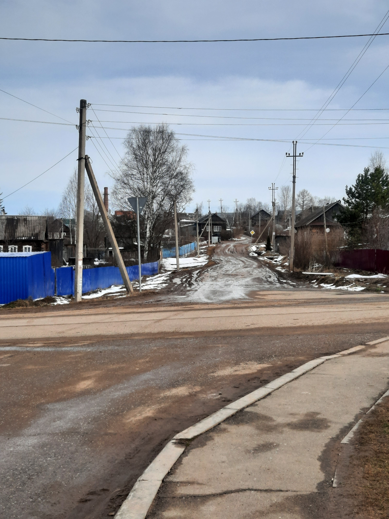 The image depicts a street scene in what appears to be a rural or semi-rural area in Krasnogorskoye, Russia. The road is unpaved and appears wet or muddy, with some areas showing signs of melting snow or ice. A sidewalk runs along the right side of the road, partially obscured by shadows and puddles. Utility poles with overhead power lines run along the left side of the road, connecting buildings. Blue corrugated metal fences or walls are visible along the left side of the road. The architecture consists primarily of older, wooden houses, some of which are partially obscured by trees and other vegetation. Bare trees and some evergreen trees are scattered throughout the scene, indicating it may be late winter or early spring. The sky is overcast, with a mix of clouds. | Open Wire