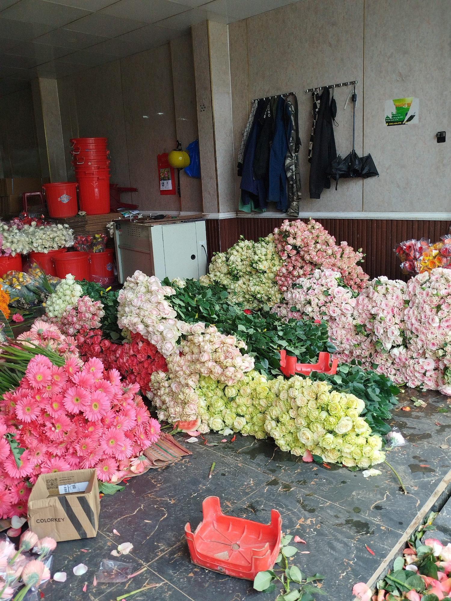 The image captures a flower market scene, possibly in the Cam Ly area of Đà Lạt, Vietnam, as flower cultivation is prevalent in the region. Heaps of various flower types, primarily roses and gerbera d…read more