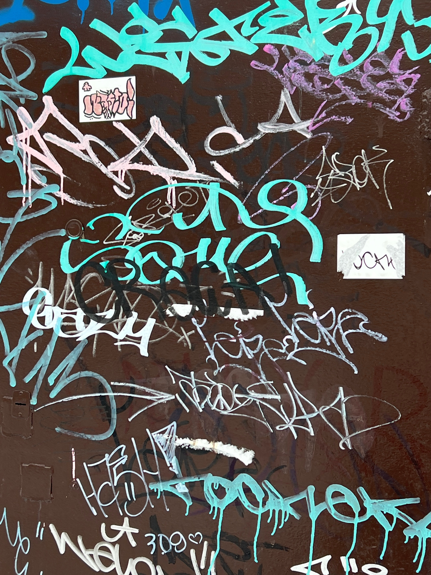 The image depicts a densely tagged and stickered dark brown surface, possibly a wall or large metal object. A variety of graffiti styles are present, using a range of colors including bright teal, whi…read more