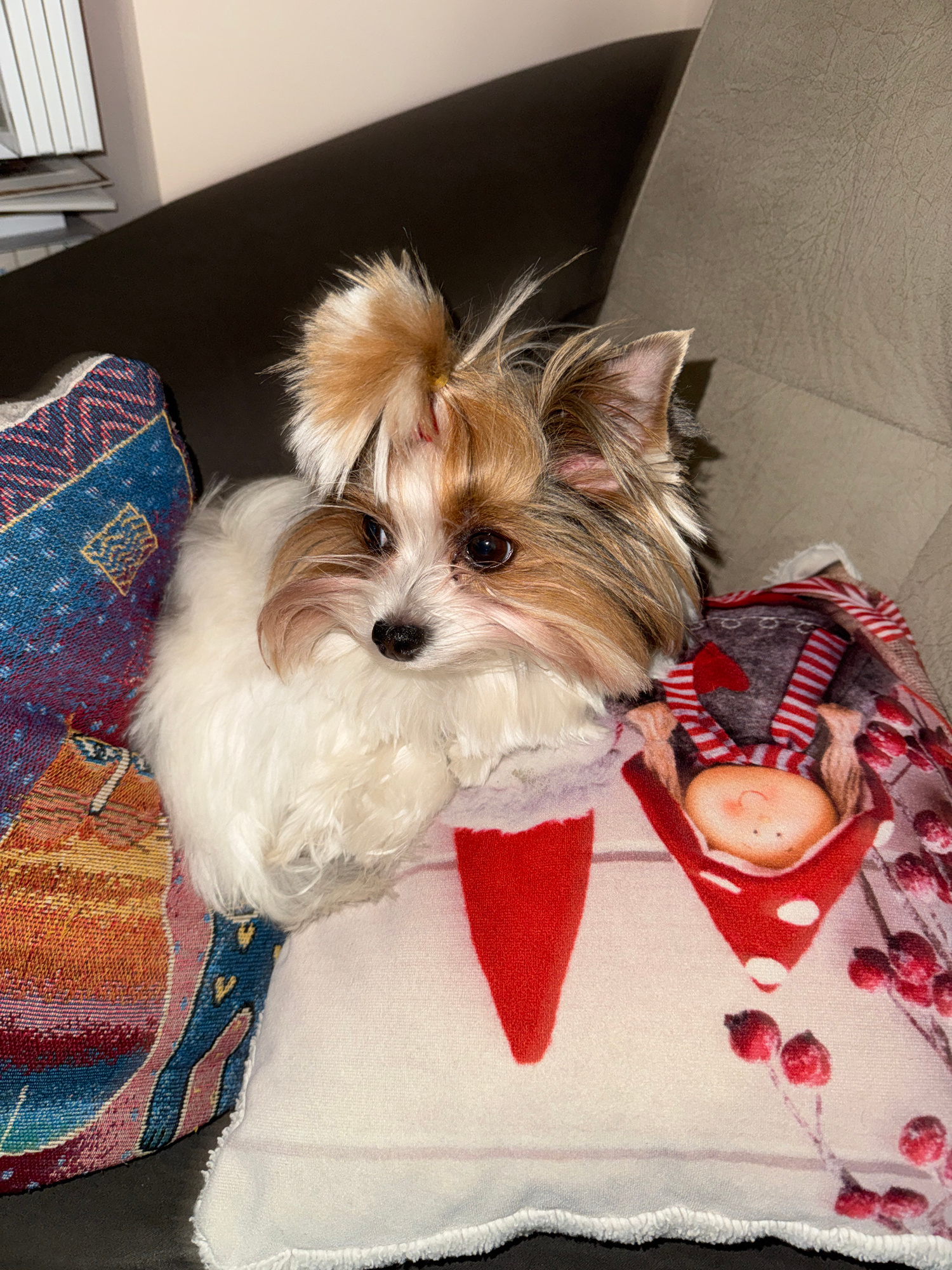 A small, tan-and-white long-haired dog with dark eyes and a black nose is lying on two pillows on a sofa. One pillow is decorated with a drawing of a girl in a red hat. The other pillow has a blue andβ¦read more