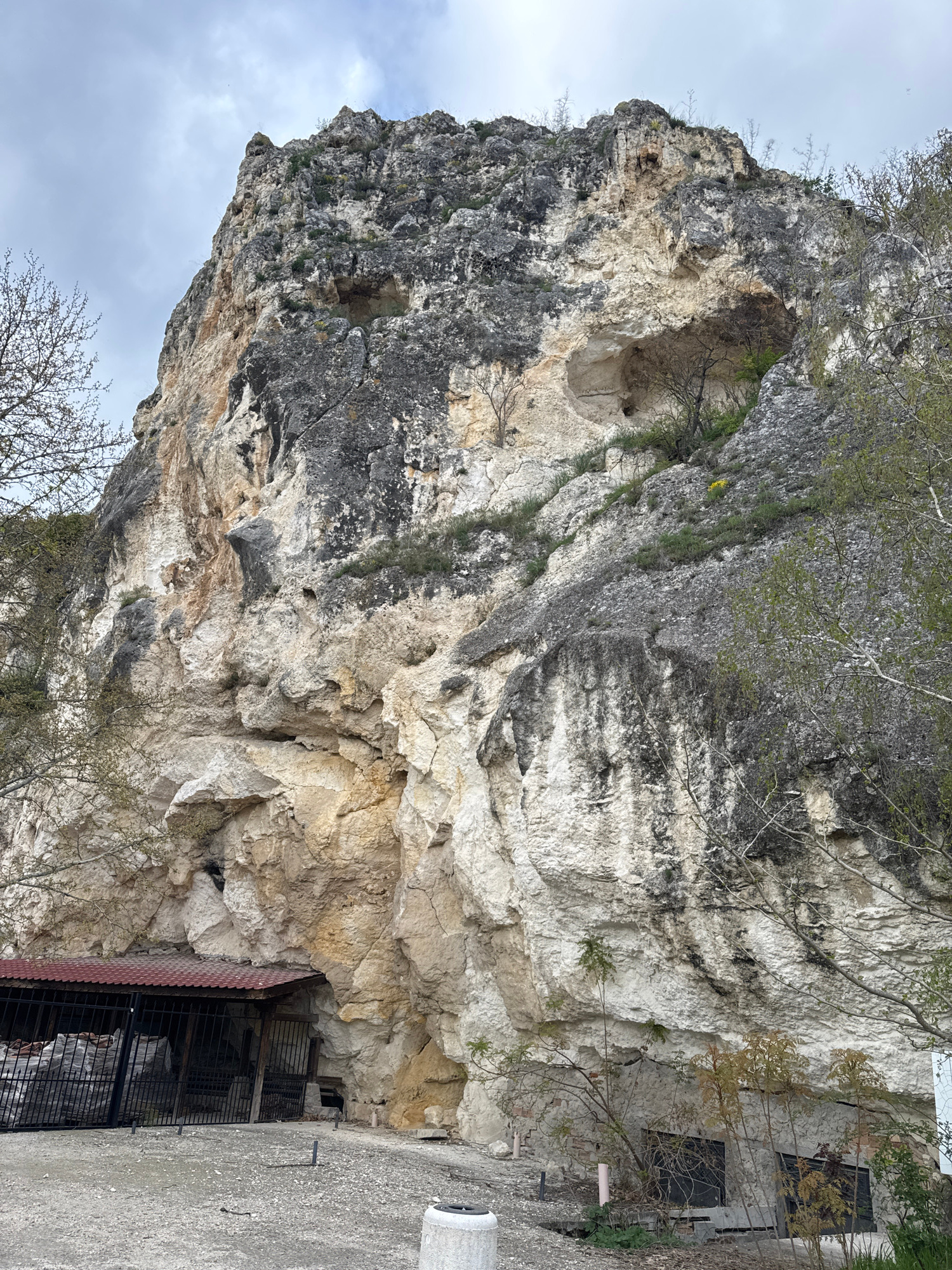 The image shows a large rock formation with a cave entrance. The rock face is textured with layers of gray, white, and beige stone. Some greenery is growing on top and around the rock. At the bottom,…read more
