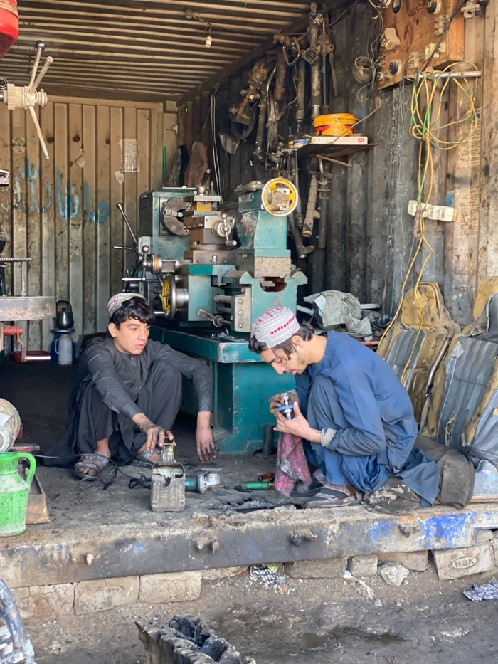 Inside a dilapidated workshop in Kandahar, Afghanistan, two young males are engaged in mechanical work. The workshop appears to be housed within a corrugated metal shipping container or similar struct…read more