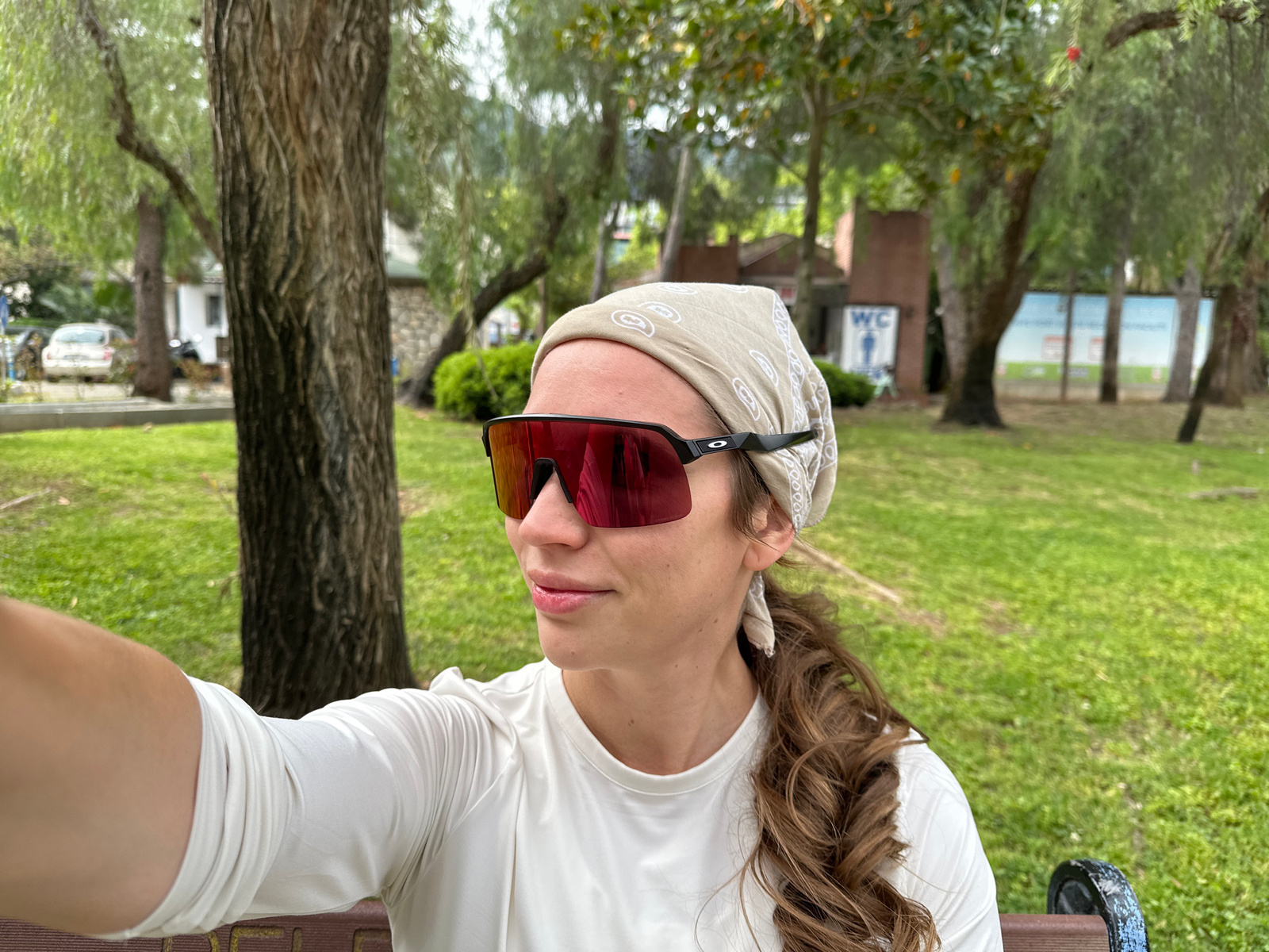 A medium shot shows a person with light skin wearing a white long-sleeve shirt, a beige bandana, and black sunglasses with red lenses, as seen in Fethiye, Turkey. The person is reclining, possibly on…read more