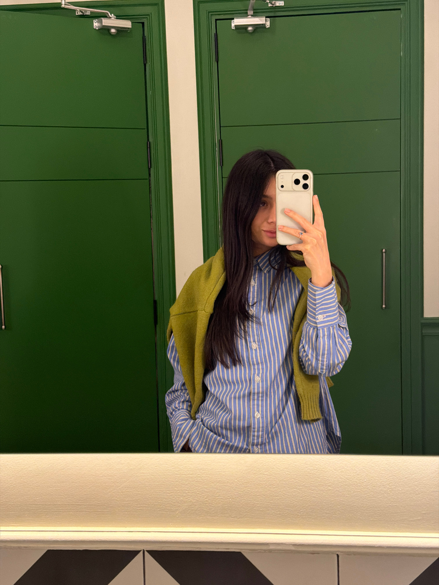 A mirror selfie depicts a female in a public restroom setting, identifiable as The Alexander, a Luxury Collection Hotel, Yerevan, Armenia, specifically within its public restroom facilities at Abovyan…read more