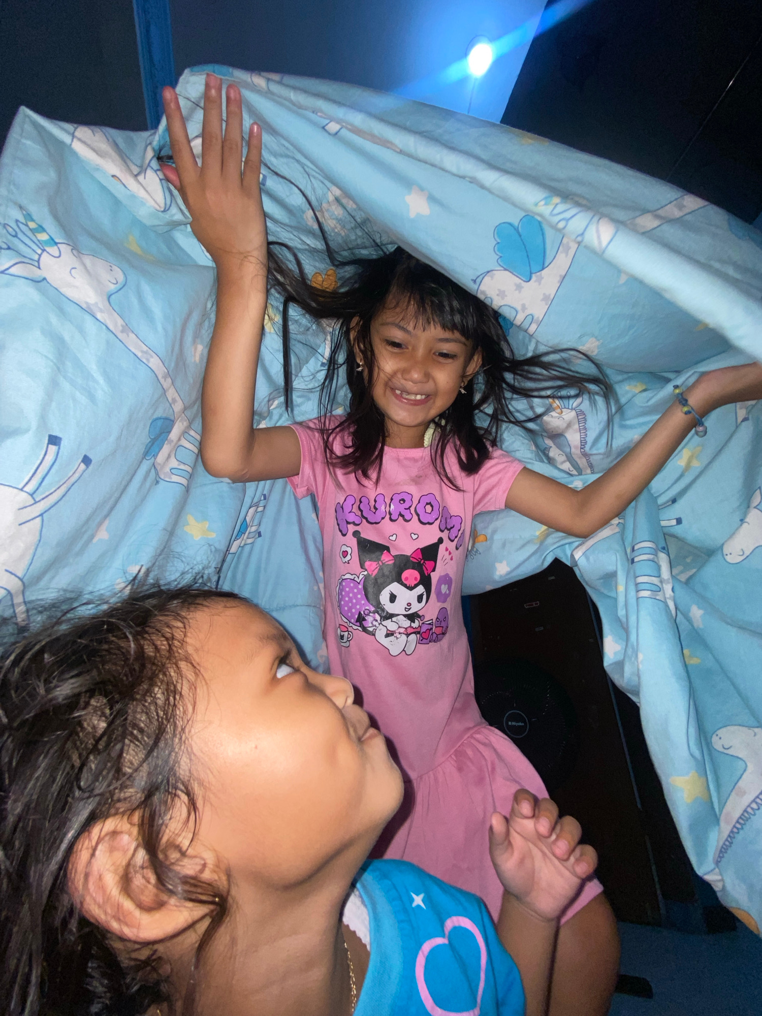 Two girls are lying on a blue blanket patterned with giraffes and stars. The girl on the left is wearing a pink t-shirt with a cartoon character on it and has her arms outstretched above her head. The…read more