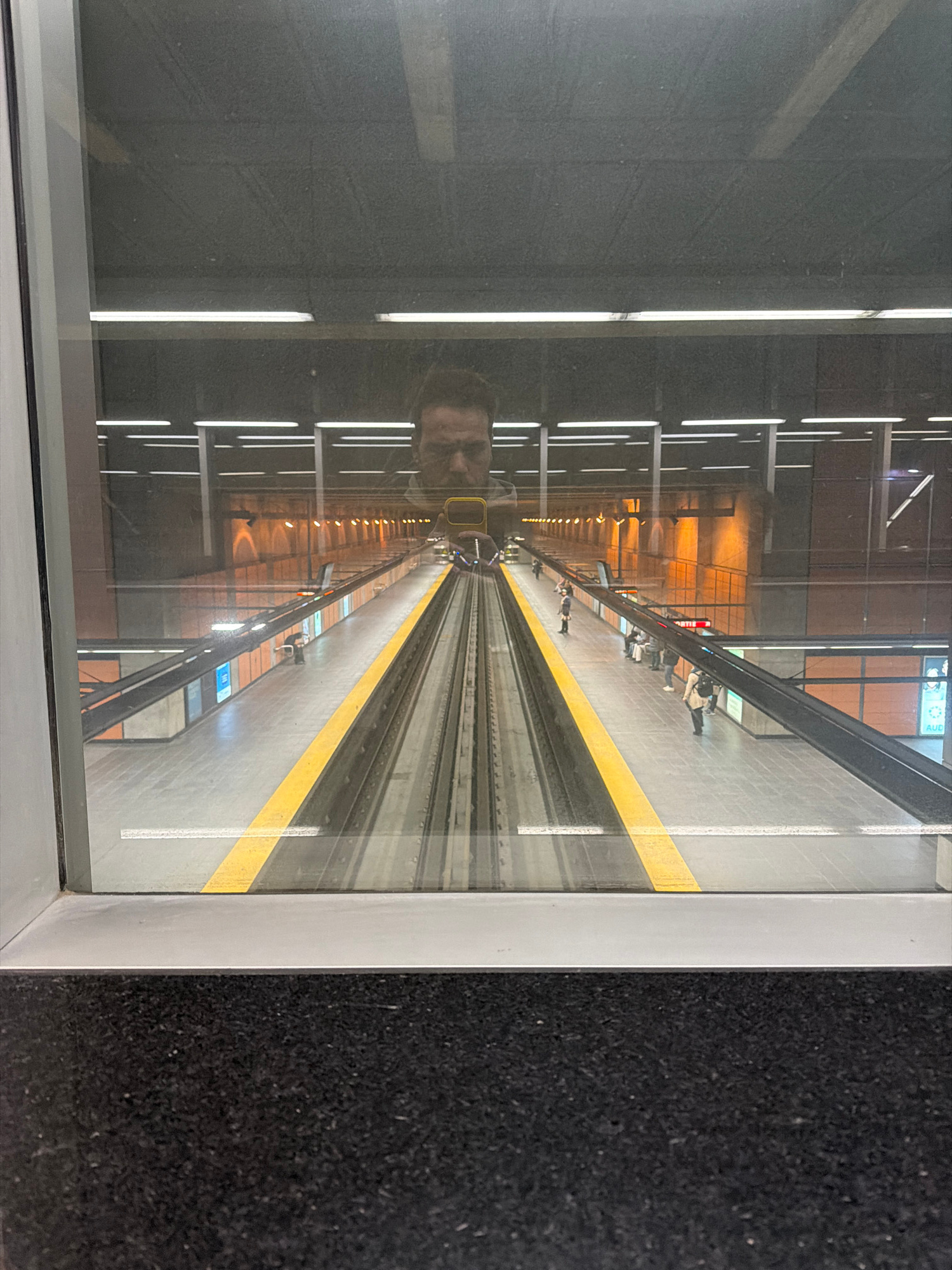 The image shows a view of a Laval, Canada subway station platform through a glass window. The platform is lined with a yellow safety strip and waiting passengers. The subway tracks run parallel to the…read more