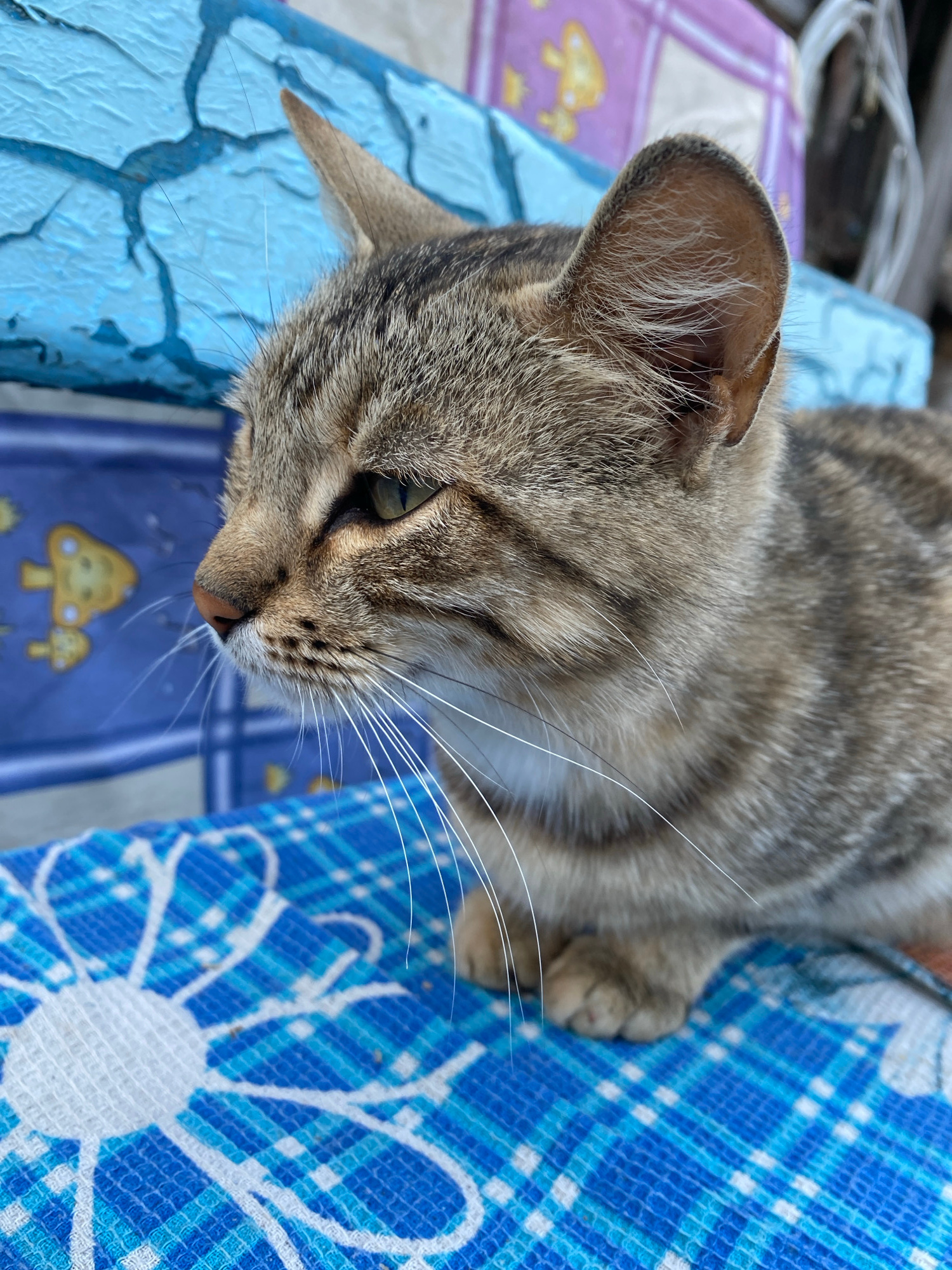 A close-up, high-angle shot captures a relaxed tabby cat resting on patterned surfaces. The cat, with its distinctive grey and brown striped fur, lies facing left, its head slightly turned towards the…read more