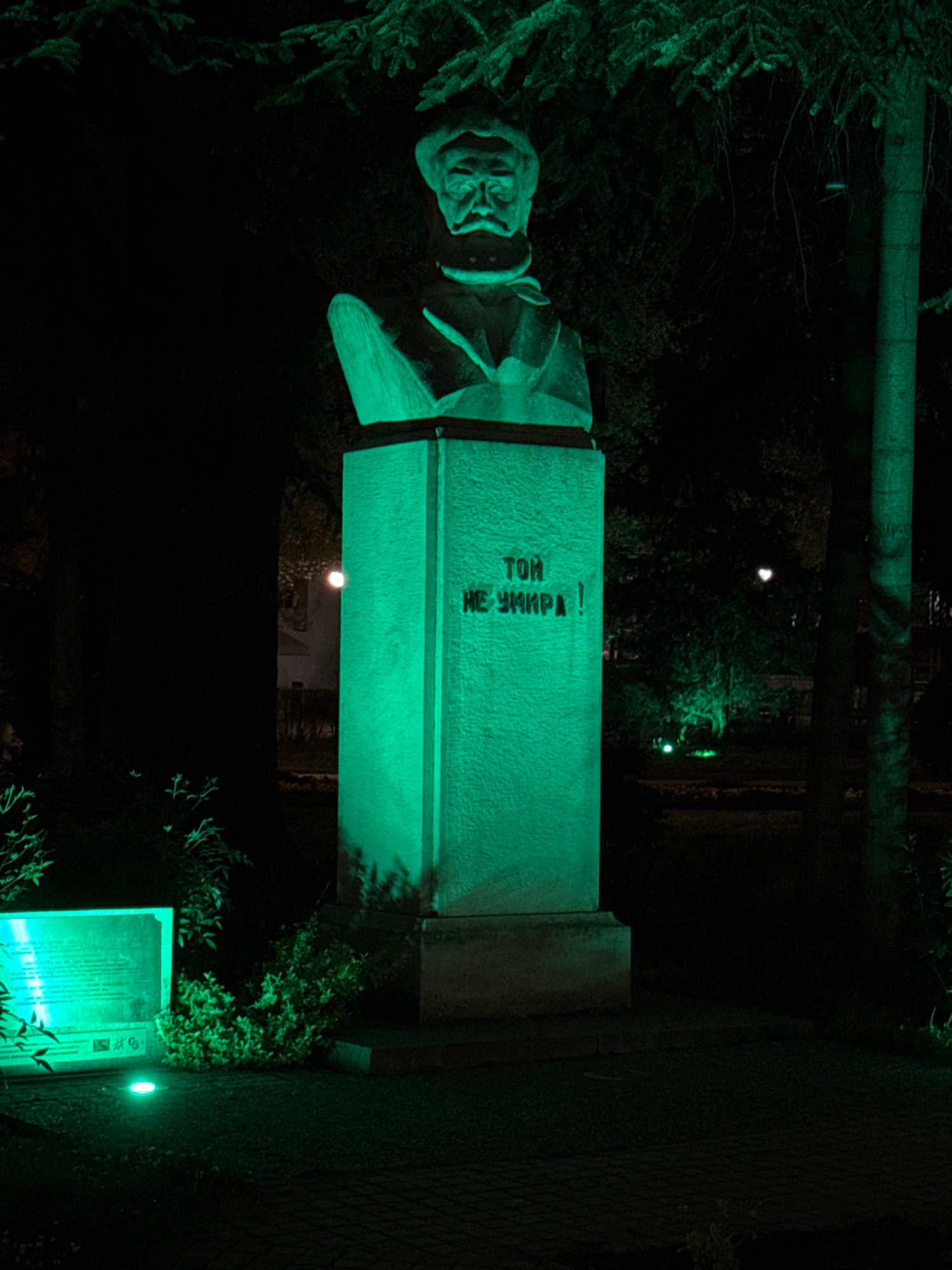 The image depicts a stone or concrete bust of a man atop a rectangular pedestal, illuminated by a strong green light at night. The man, rendered in a realistic style, wears a cap and what appears to b…read more
