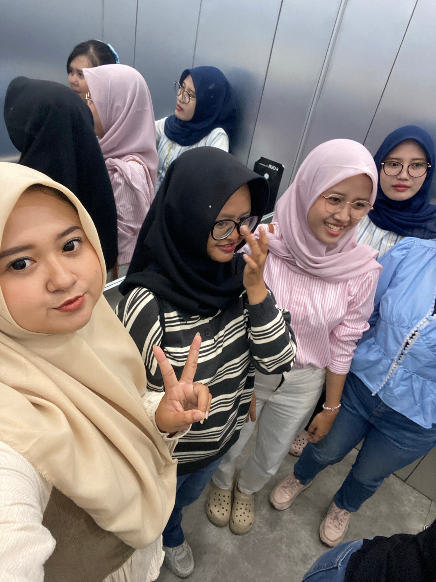 A selfie photograph shows six women in Sidoarjo, Indonesia, wearing hijabs in varying colors. From the front, one woman is wearing a beige hijab and white sweater. Behind her, a woman with glasses is…read more