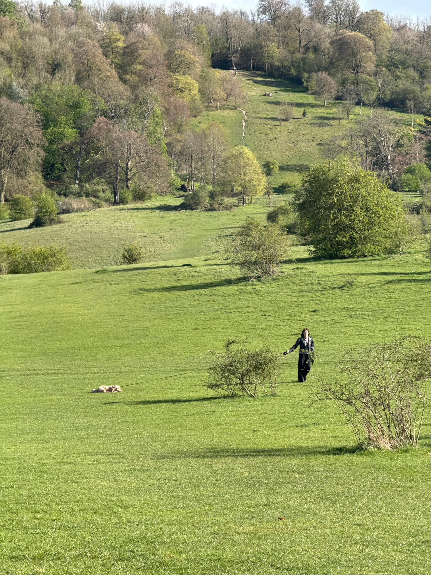 A daytime, vertical-orientation shot depicts a grassy hillside. A dark-clad figure, seemingly human, stands midway up the slope. Farther down the hill is a small quadruped, possibly a dog. The left si…read more