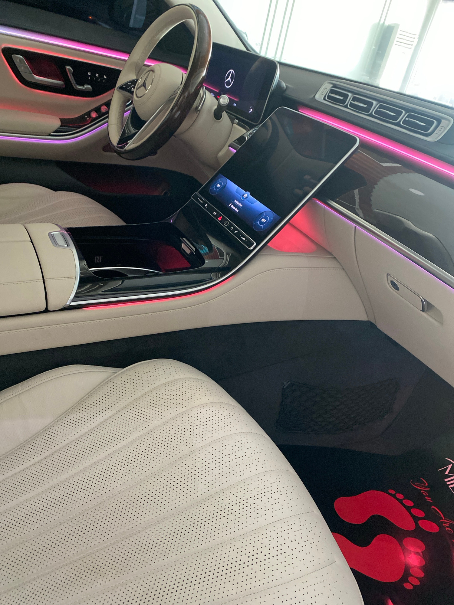 The image shows the interior of a car, likely a Mercedes-Benz, given the steering wheel emblem. Key features include a digital dashboard display, a white leather seat with perforations, ambient lighti…read more