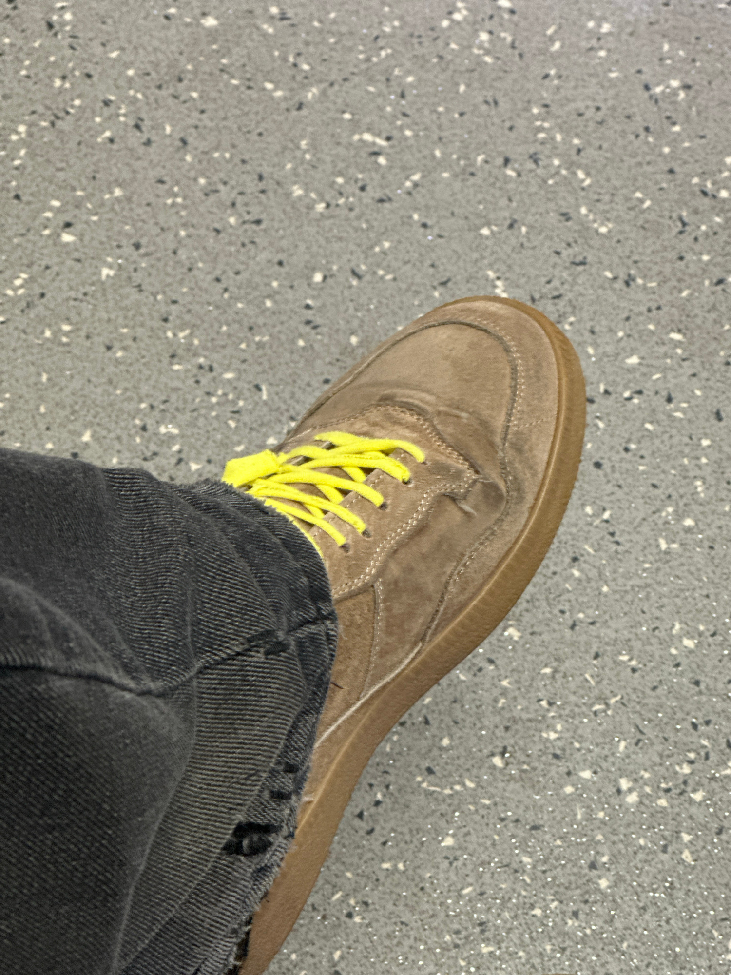 The image shows a person's foot wearing a tan suede sneaker with bright yellow laces. The person is also wearing dark grey denim jeans. The background is a speckled grey floor, likely a public space.…read more