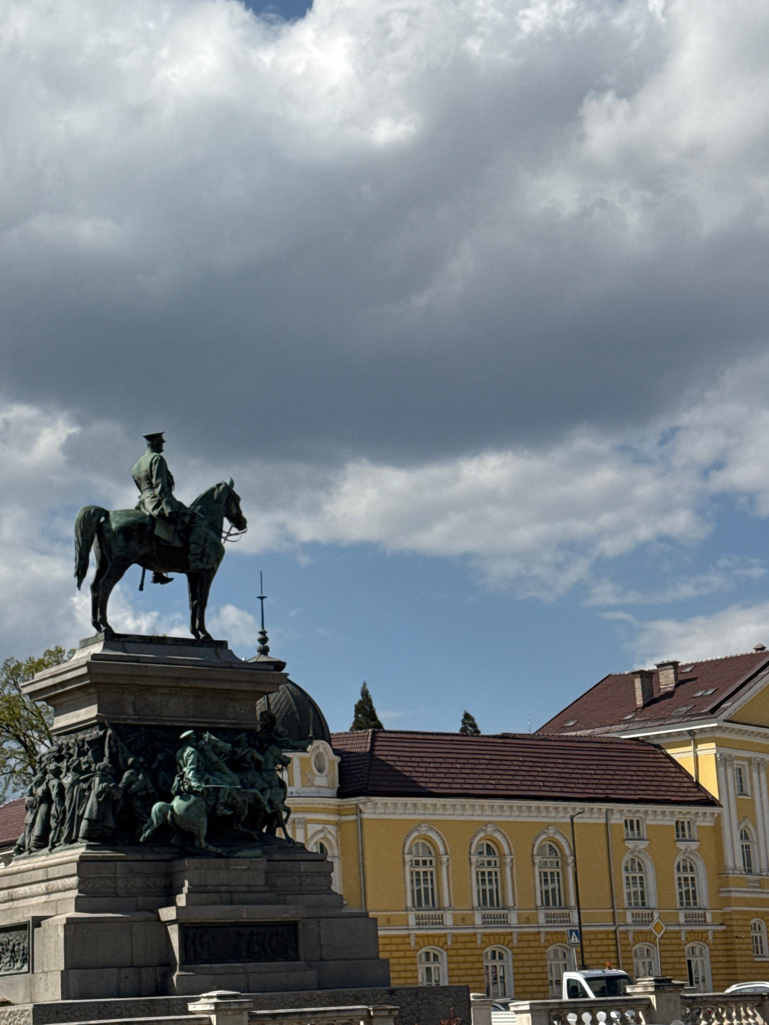 The image, taken in Sofia, Bulgaria, captures an outdoor daytime scene featuring a prominent equestrian monument positioned in front of a historic building, all set under a partly cloudy sky. The cent…read more