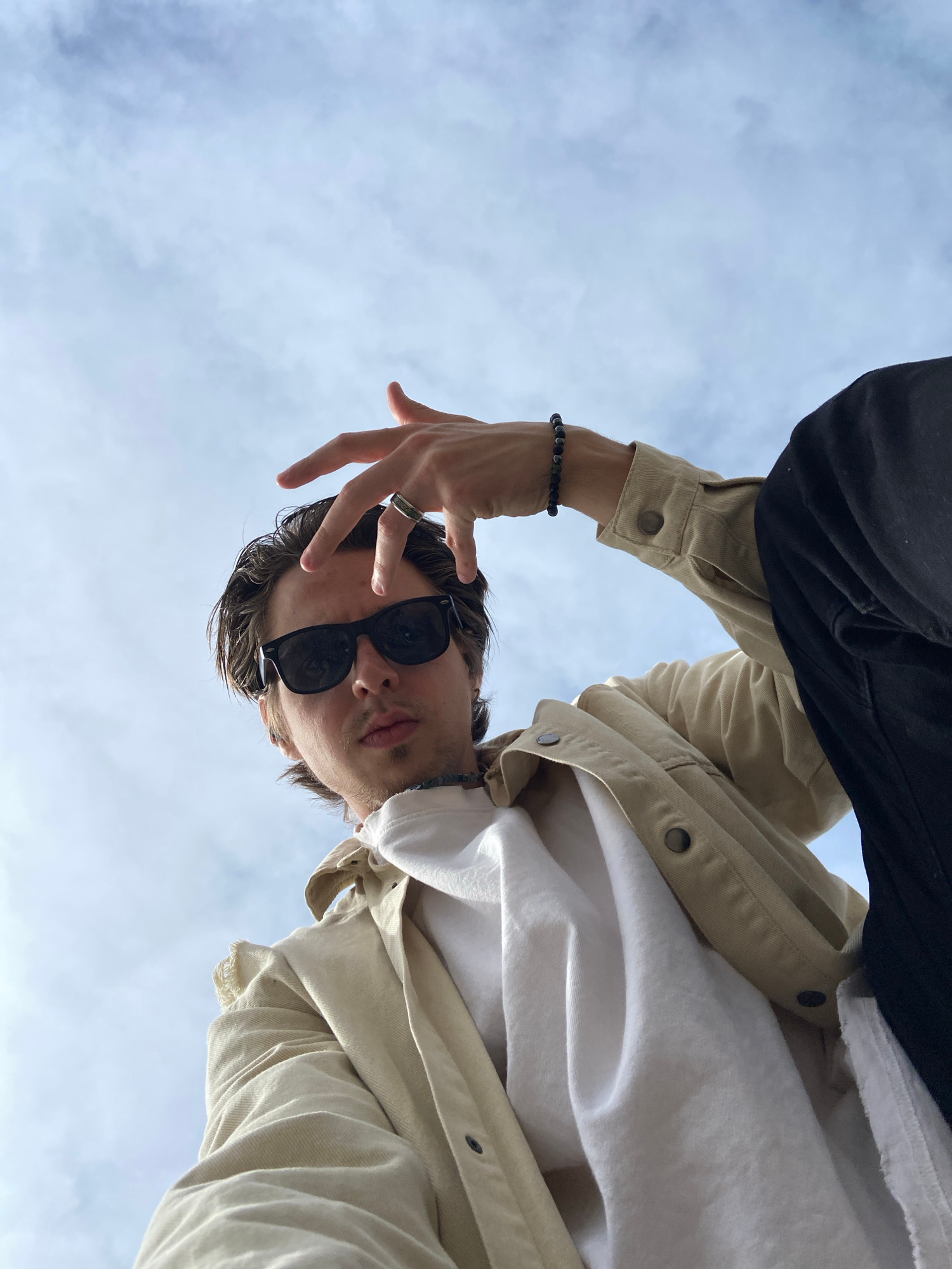 The image shows a low-angle perspective of a person wearing sunglasses, a white top, and a tan overshirt, with the sky in the background. The person's hand is raised. The sky appears to have light clo…read more