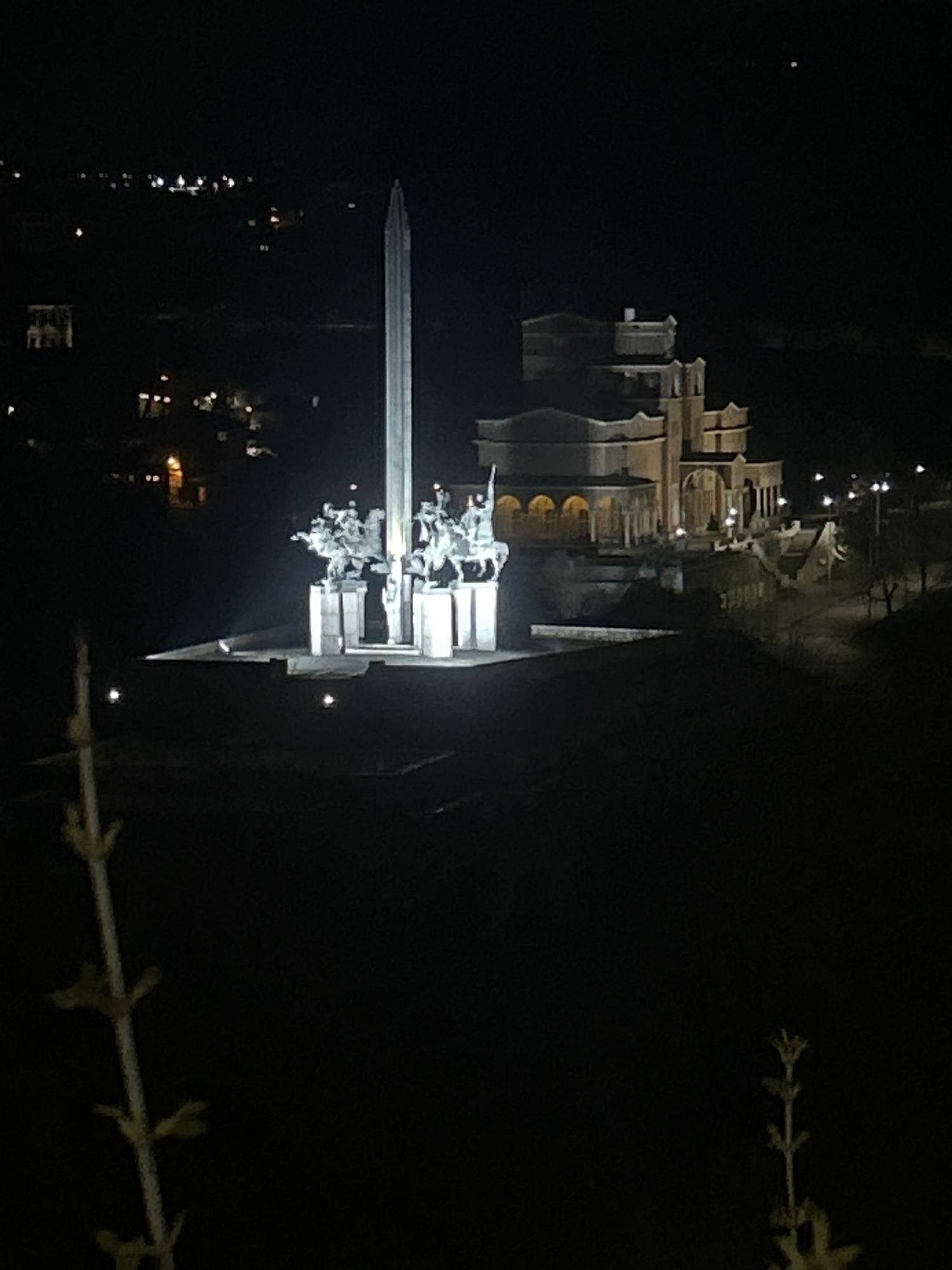 The image depicts the "Mother Bulgaria" monument in Veliko Tarnovo, Bulgaria, at night. The monument features a large vertical sword and statues of soldiers and other figures. The lights illuminate th…read more