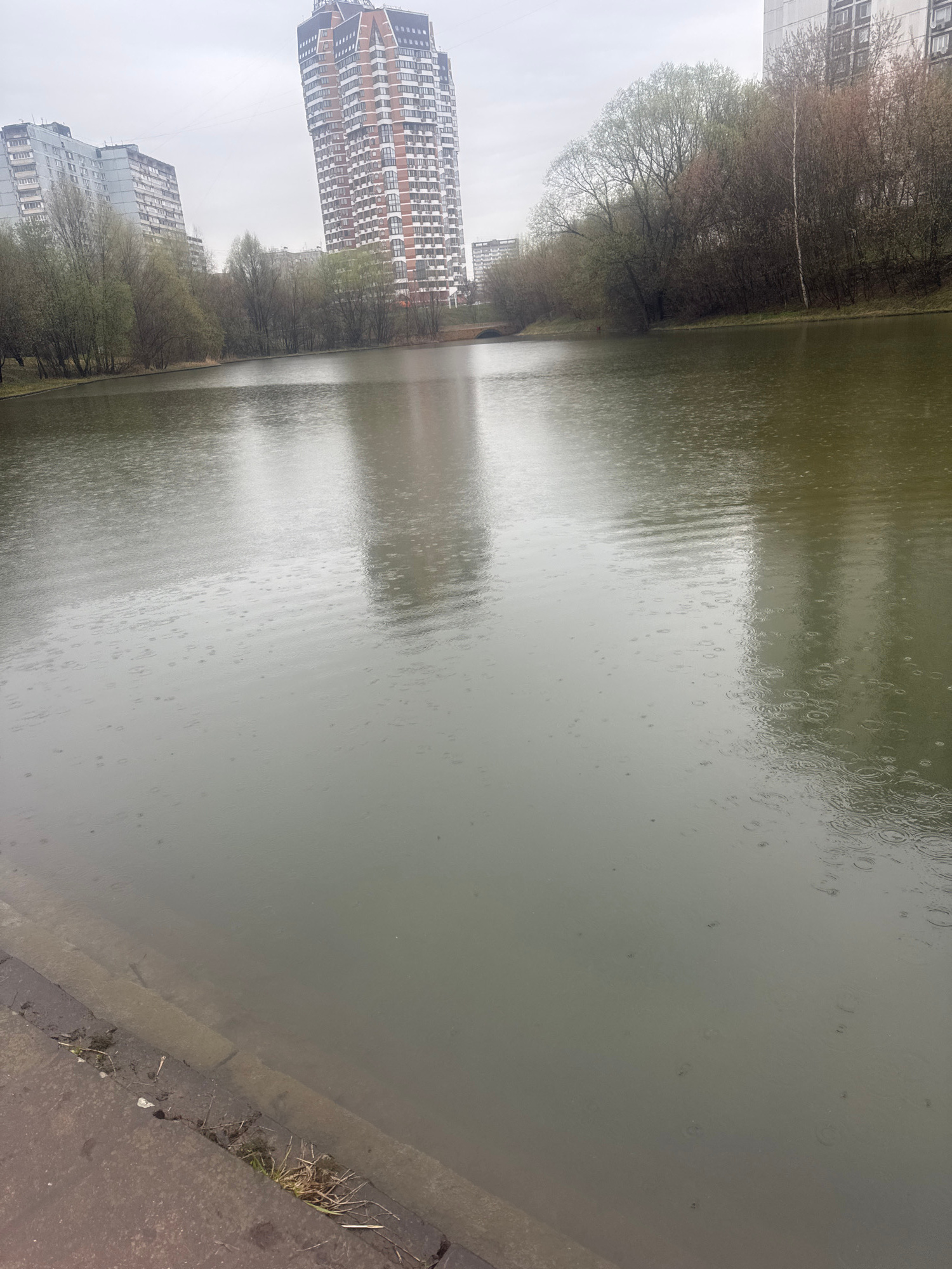 The image shows a murky lake with raindrops disturbing the surface. On the left, there are several high-rise buildings, including one with a distinctive red and white facade. These buildings suggest a…read more