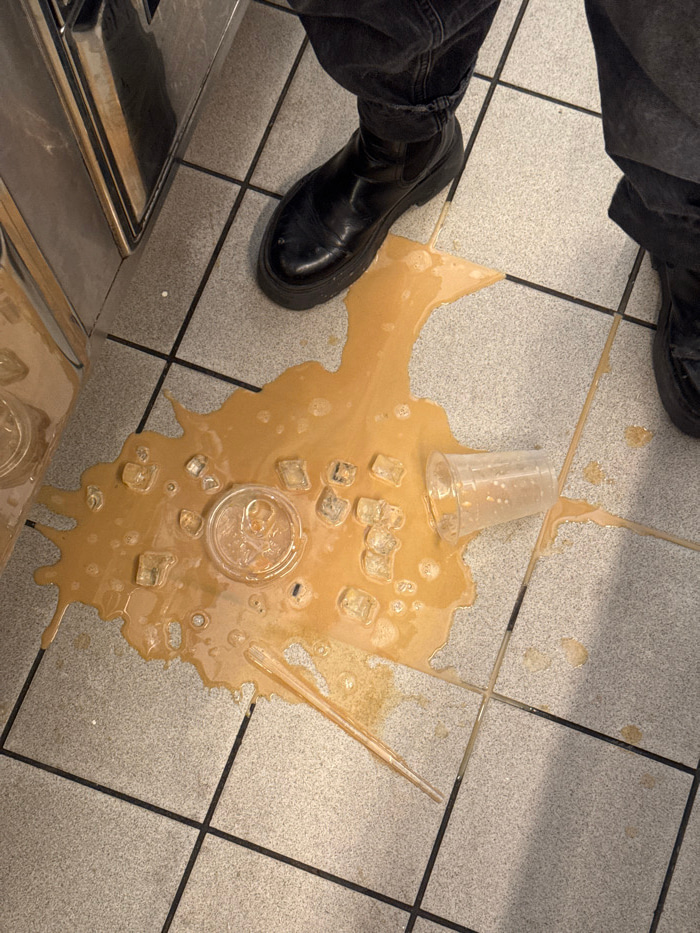 An overhead photograph depicts a large spill on a light grey tiled floor within an indoor establishment in Tel-Aviv, Israel. A substantial puddle of light brown, opaque liquid, containing numerous cle…read more