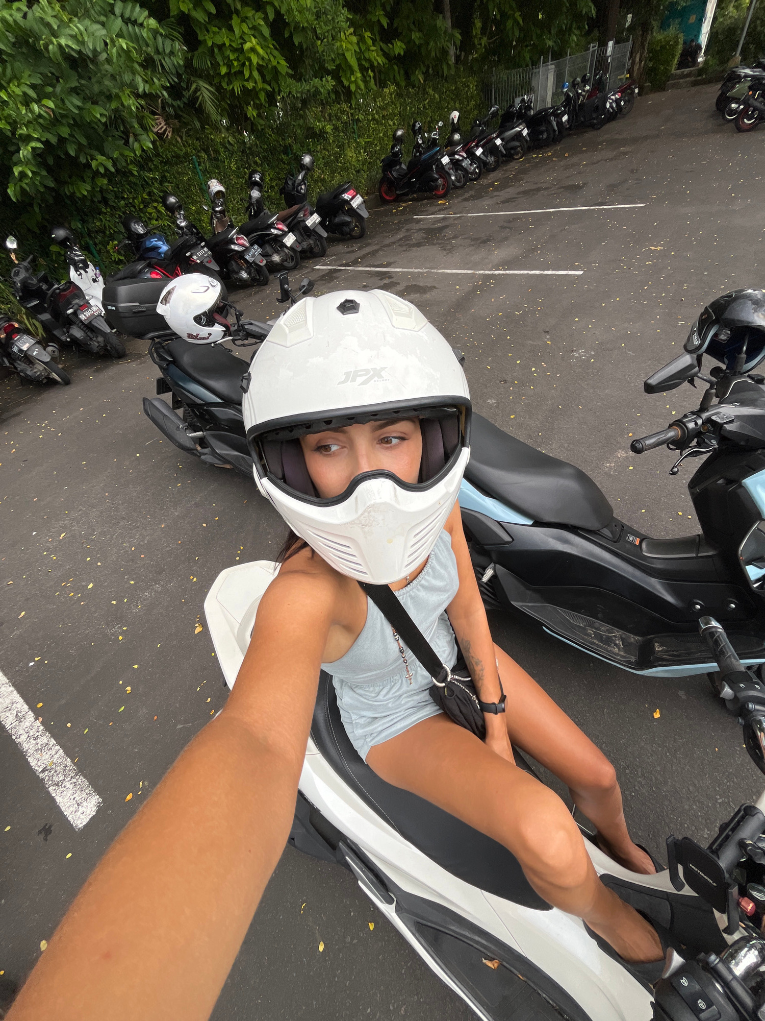 A first-person view selfie captures a person sitting on a light blue and black scooter in an outdoor parking area in Kuta Selatan, Indonesia. The person, appearing female, wears a white full-face helm…read more