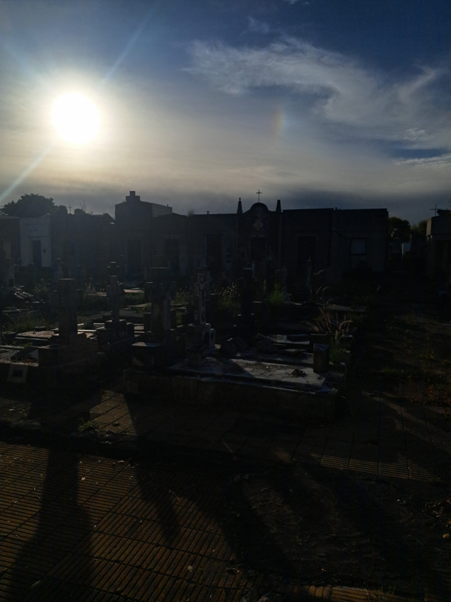 The image shows a cemetery in Vicente López, Argentina, taken against the sun. The graves are silhouetted. A paved path runs along the right side of the image. The sky is bright with the sun obscuring…read more