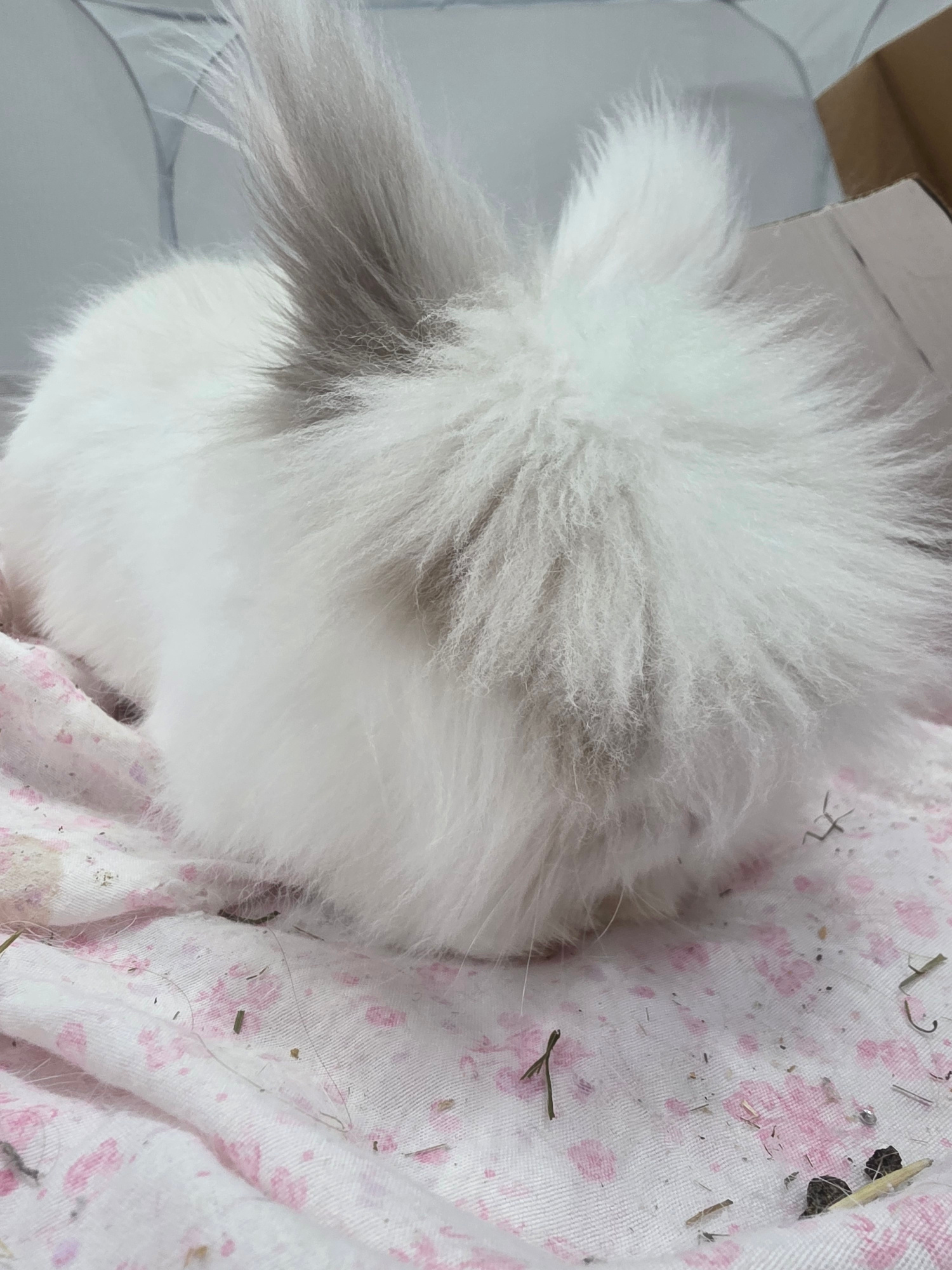 A close-up overhead shot shows a fluffy white rabbit on a pink and white patterned cloth. Some loose hay and debris are scattered on the cloth. The rabbit has some grey shading on its fur. A corner of…read more