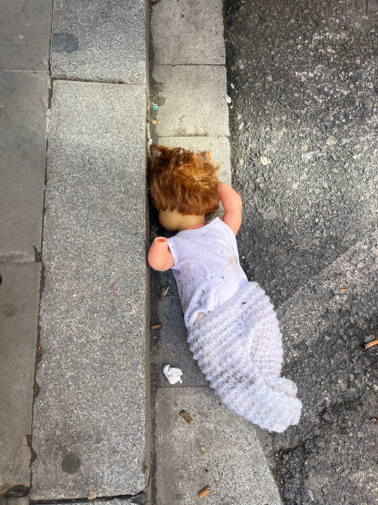 A discarded doll lies on its side on an urban street, partially on dark gray asphalt and partially on a light gray granite curb. The doll has reddish-orange hair and is dressed in a white top, with it…read more