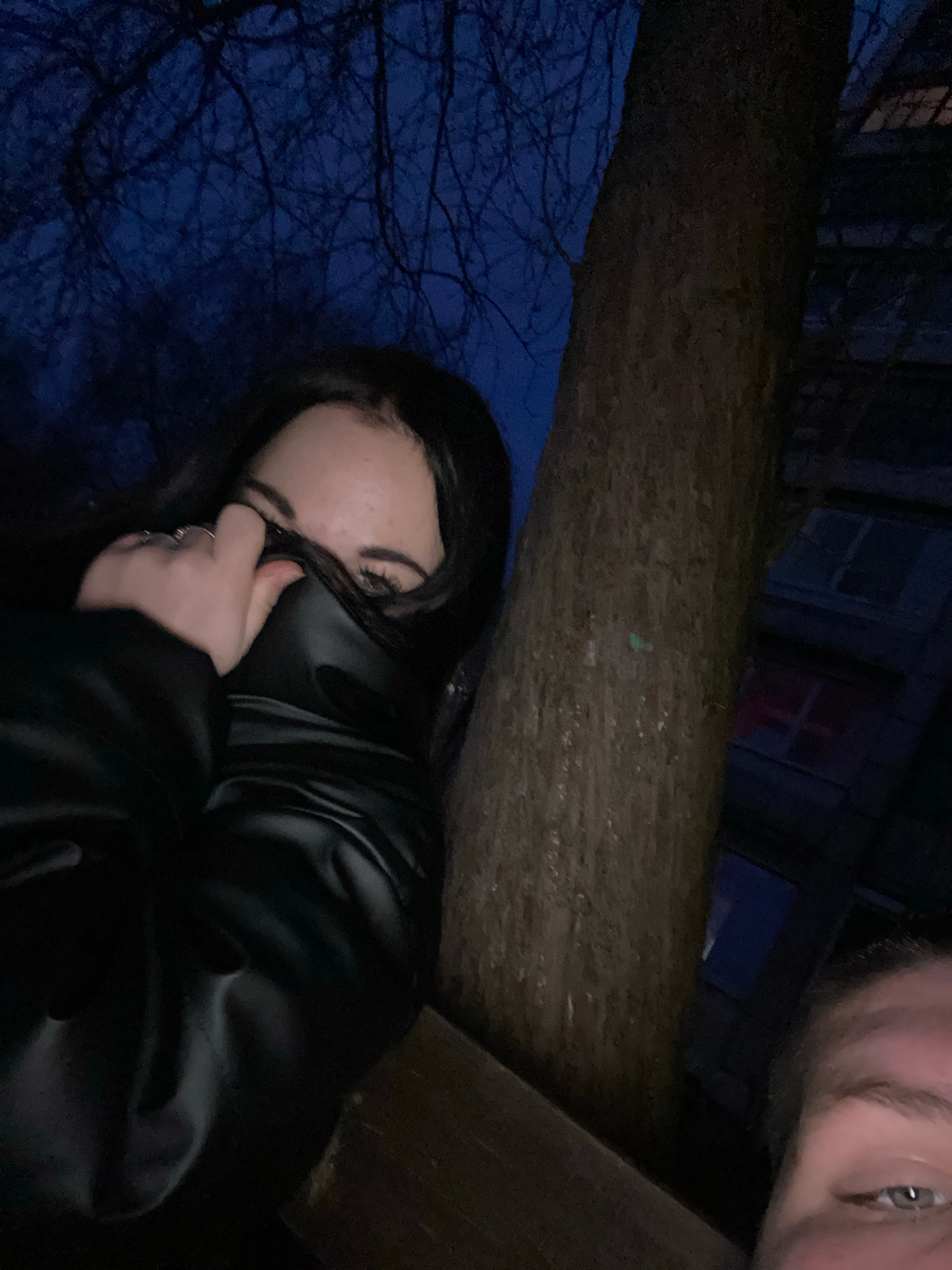 A low-angle, close-up photograph taken at night depicts two individuals. One person, a young woman, is in the foreground wearing a black jacket and partially covering her face with her hand. Rings areβ¦read more