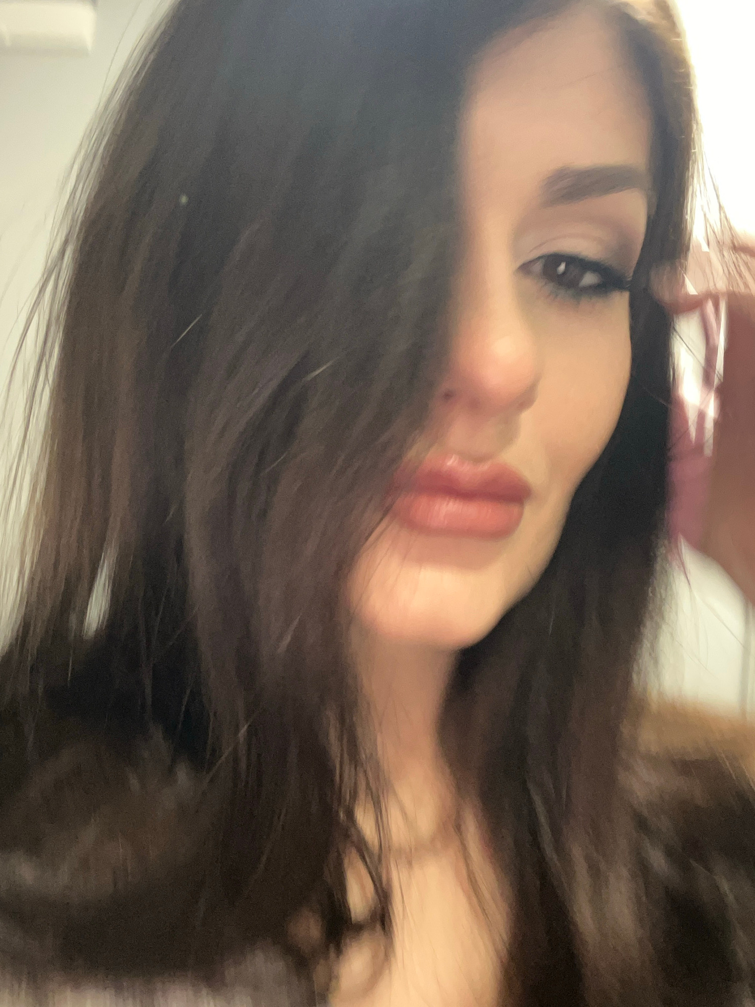 A close-up, slightly angled portrait of a person with dark brown hair partially obscuring their face. Visible features include an eye with dark eyeliner, a nose, and full lips with a glossy finish. Th…read more