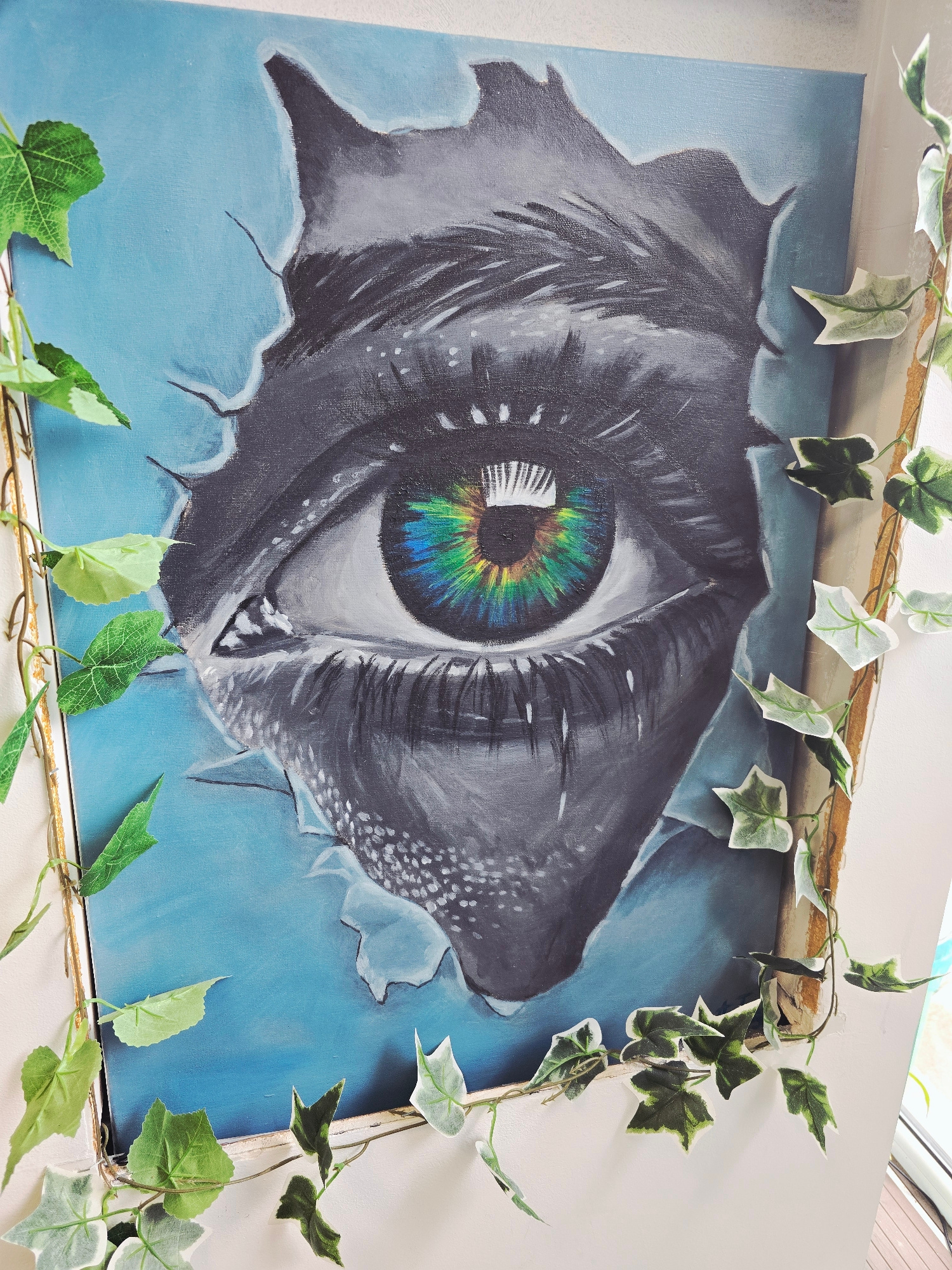A framed painting dominates the view, portraying a singular eye bursting through a light blue background. The eye itself is intricately detailed with a colorful, rainbow-hued iris surrounded by monoch…read more