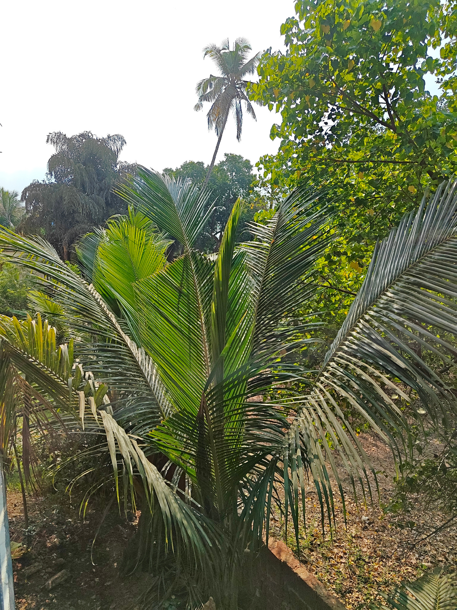 The image shows a view in Arambol, India, featuring lush greenery. A young coconut palm is prominently positioned in the foreground, its fronds displaying varying shades of green. Behind this palm are…read more
