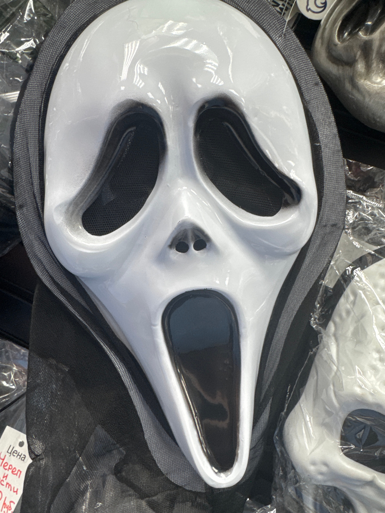 A white "Scream" mask is the main subject, lying on a gray surface with black netting underneath. The mask features prominent black eye and nose holes. A price tag is visible on the lower right. The s…read more