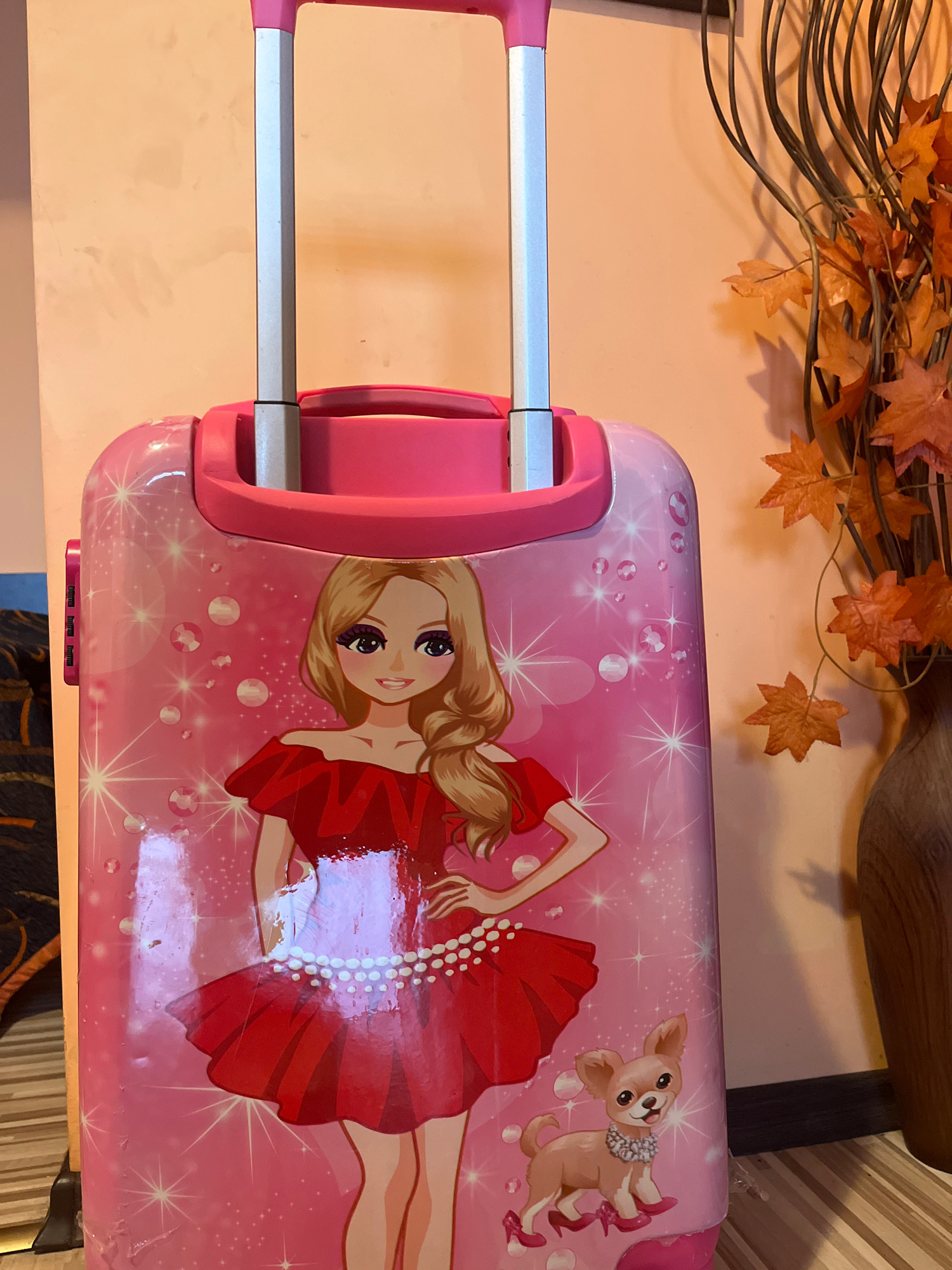 The image shows a pink children's suitcase with a cartoon girl and dog design. The suitcase handle is extended, and the background includes a wooden table, artificial autumn leaves, and a wooden objec…read more