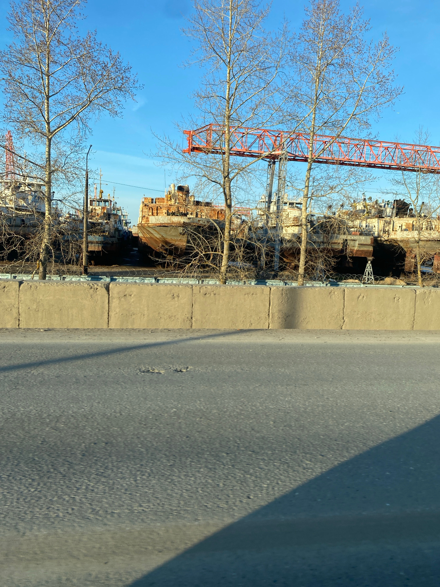 This media file captures a waterside industrial scene in Chaikovsky, Russia, likely during late autumn, winter, or early spring. The photograph is taken from what appears to be a road or pavement, whi…read more