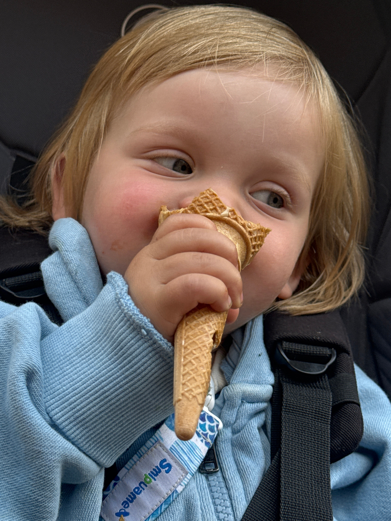 A fair-skinned, blonde-haired child is positioned in a black car seat. The child is holding and eating an ice cream cone in their right hand. The child is wearing a light blue sweater with a white tag…read more