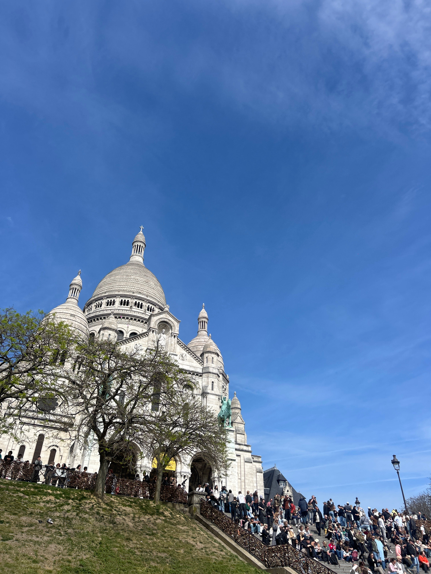 The Sacré-Cœur Basilica is shown on a bright day in Paris. The structure is mostly white and is capped by several domes and turrets. A bare tree partially obscures the front of the building. Many peop…read more