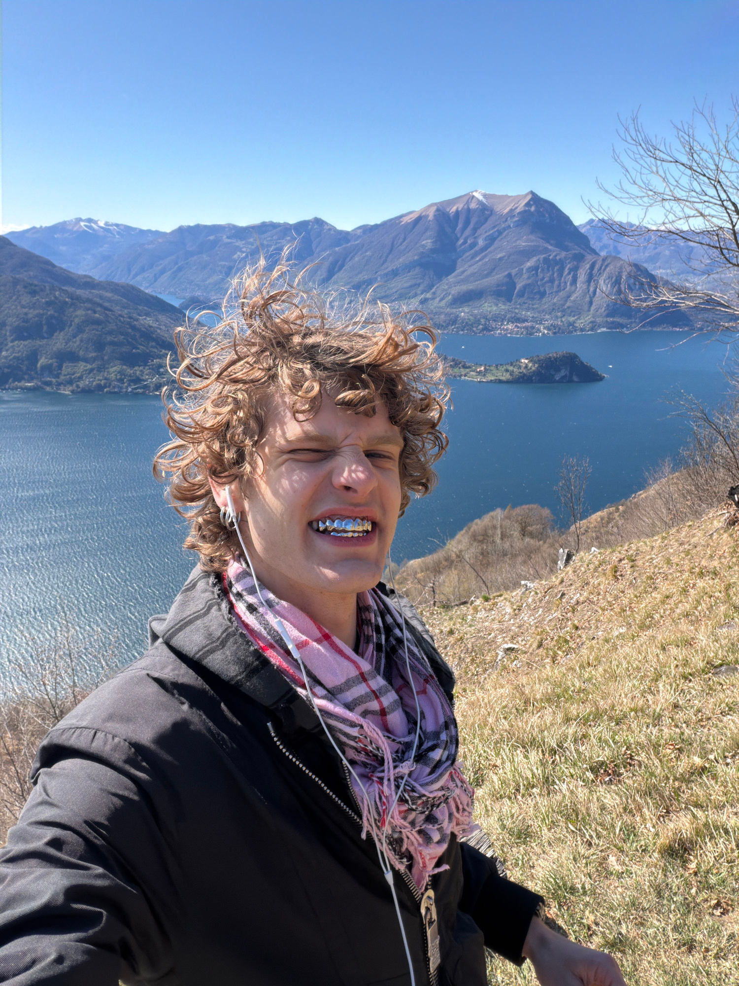 A close-up selfie shows a person with curly, light brown hair, a black jacket, and a pink and black plaid scarf. They are smiling with their eyes closed, displaying silver dental grills. White wired e…read more