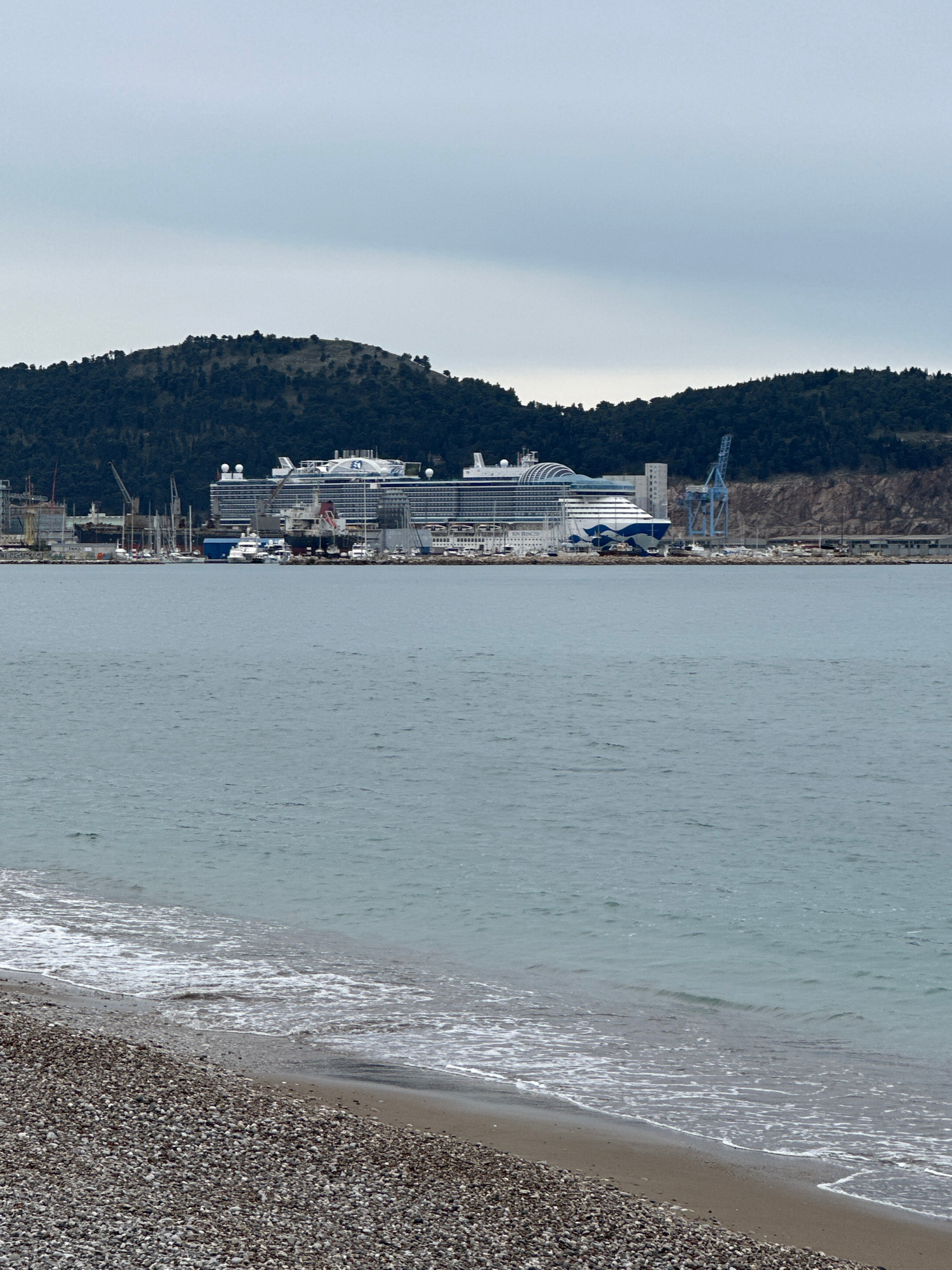 The scene depicts a harbor with multiple large cruise ships docked. The ships are white with blue and gold accents and are moored parallel to the coastline. A mountain range densely covered with trees…read more