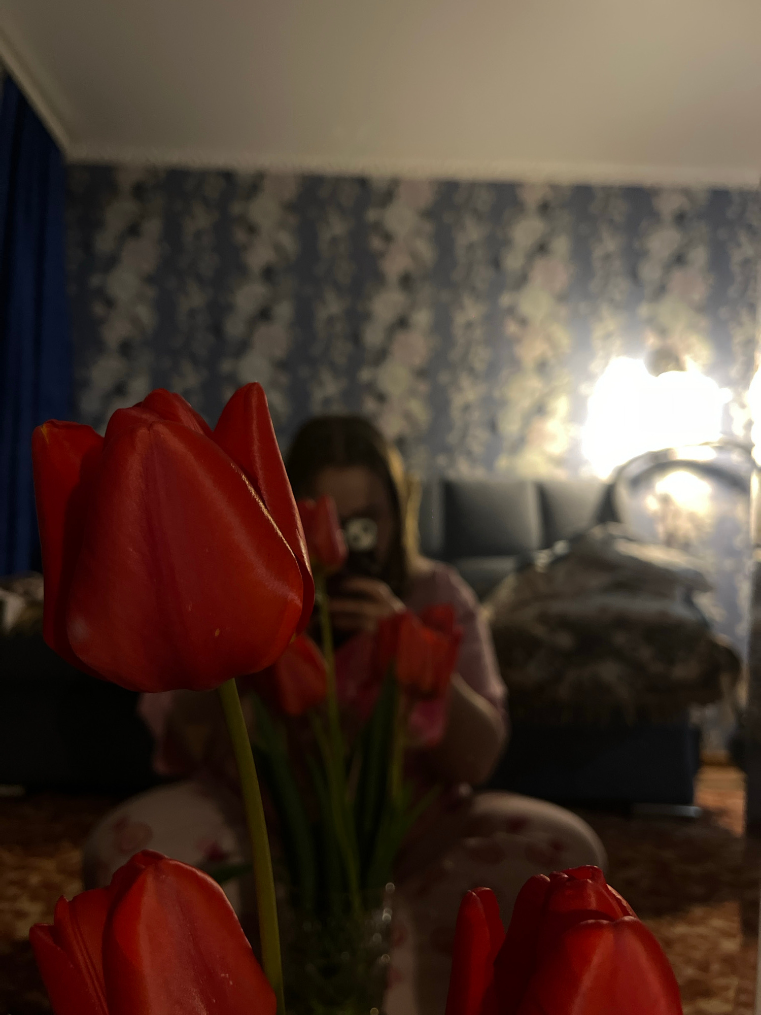 The image, taken in Novopokrovskaya, Russia, depicts an indoor scene with a shallow depth of field, focusing sharply on several vibrant red tulips in the foreground and mid-ground. The tulips, with th…read more