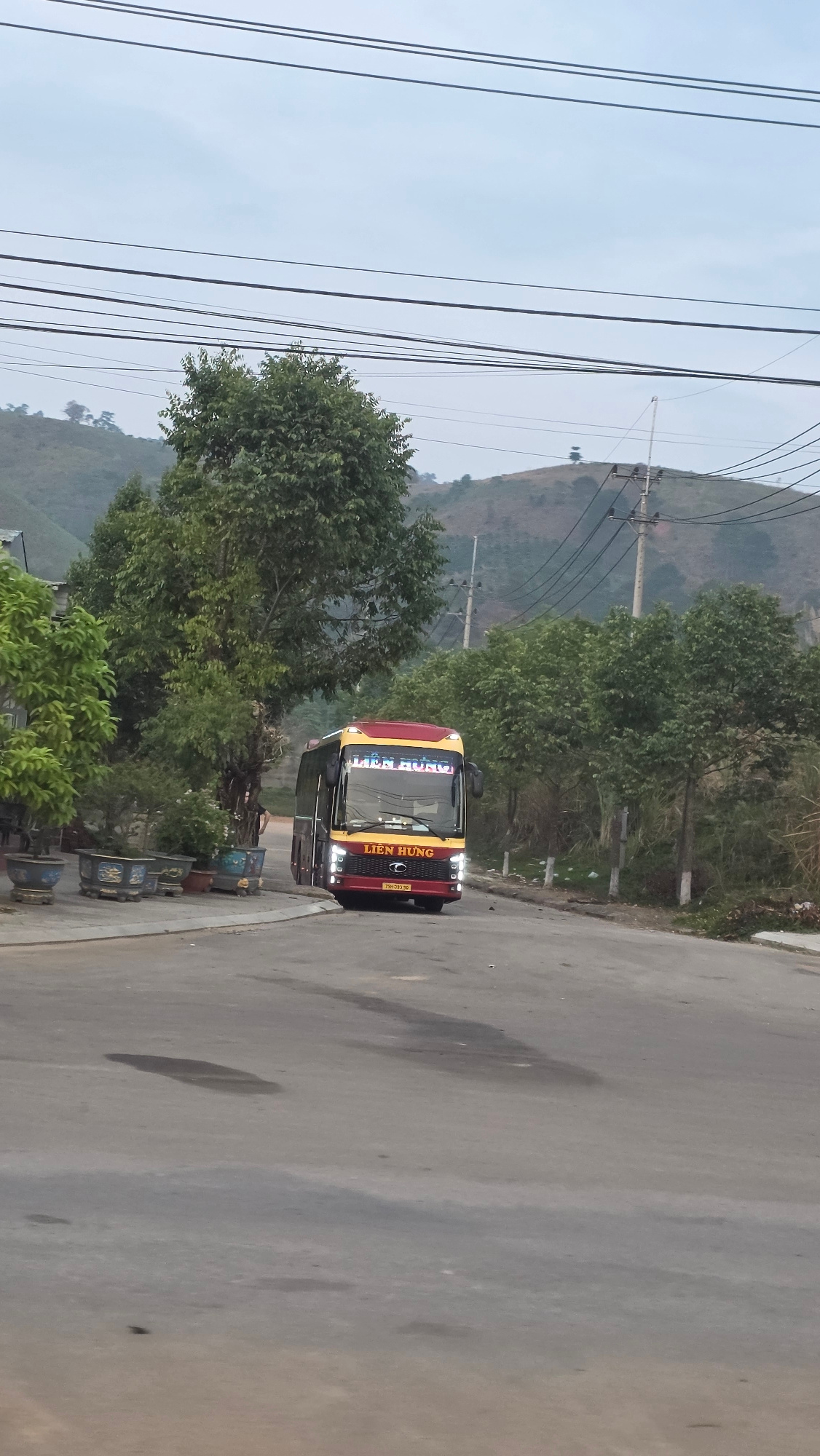 The image shows a bus driving on a road near Bo Y, Vietnam. The bus is red and yellow and has the words "LIEN HUNG" written on the front. There are trees and a hill in the background, along with power…read more