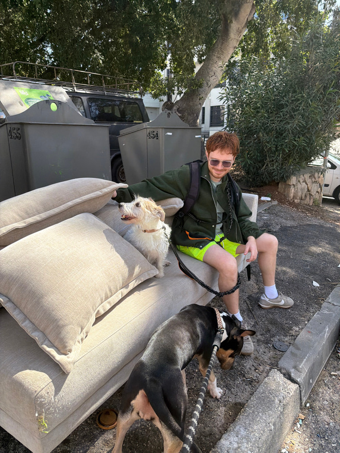 The image depicts an outdoor urban scene in Tel-Aviv, Israel, identifiable by the distinct municipal waste bins. A light-skinned male, with reddish-brown hair and a slight beard, is seated on a discar…read more