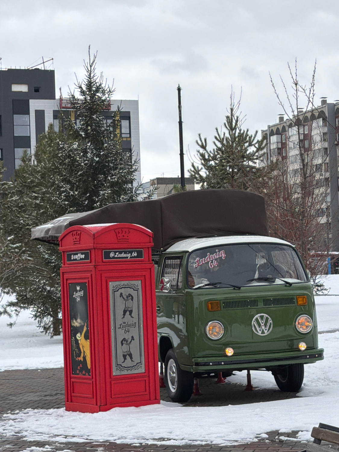 This outdoor image, likely captured in Krasnoyarsk, Russia, presents a winter scene featuring a vintage green and white Volkswagen van parked next to a distinctive red kiosk. Snow covers the ground anβ¦read more
