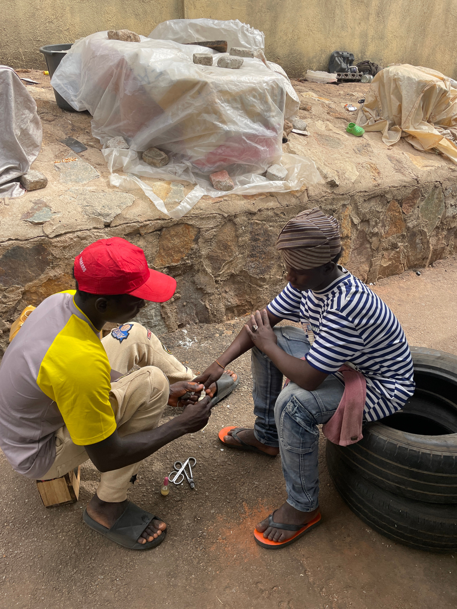 Two men are engaged in an interaction outdoors, possibly repairing something. One man, wearing a striped shirt and a head covering, kneels next to a stack of tires. The other man sits on the ground, w…read more