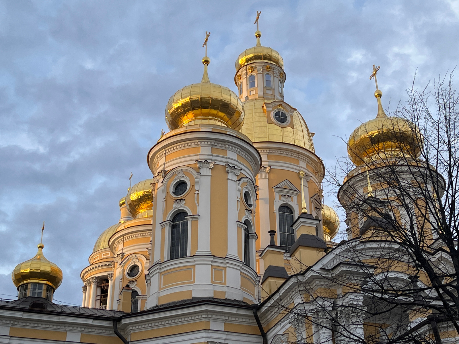 The image shows a close-up of the golden domes and ornate architecture of a building, likely a church or cathedral. The building is painted in shades of cream and yellow, with intricate detailing. The…read more