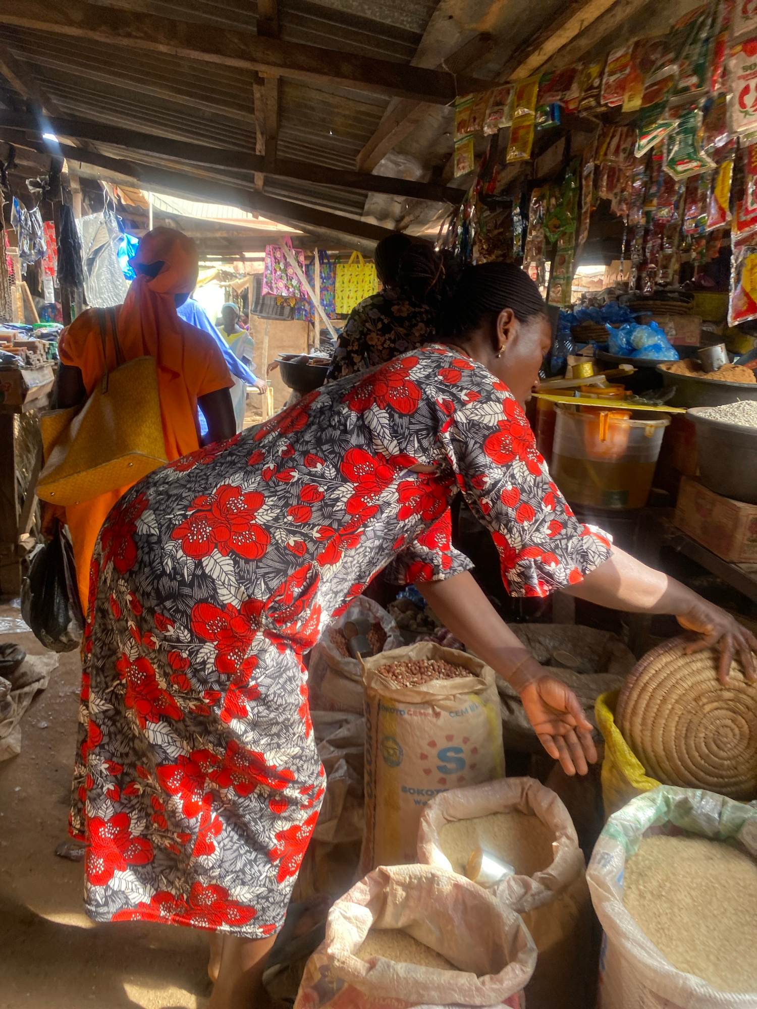 In a market in Rido, Nigeria, a woman wearing a long red, white, and black floral dress stands in a small stall, arranging items. She reaches towards a woven basket near bags filled with grains and le…read more