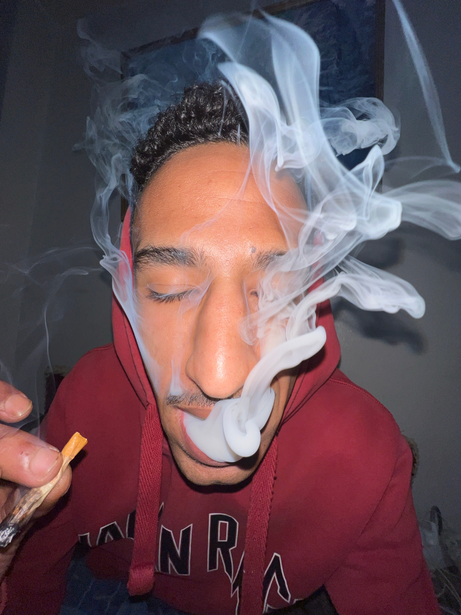An adult male is depicted in an indoor setting. He has closed eyes and is exhaling a large amount of smoke that surrounds his face. He is wearing a dark red hooded sweatshirt with white lettering part…read more